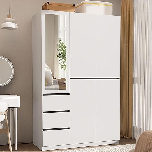 5 Doors Armoire Wardrobe Closet with 3 Drawers & Mirror, Wooden Bedroom Armoires with Hanging Rod, Freestanding Wardrobe Cabinet for Bedroom, Guest Room, White(20.5" D x 47.24" W x 74.8" H)