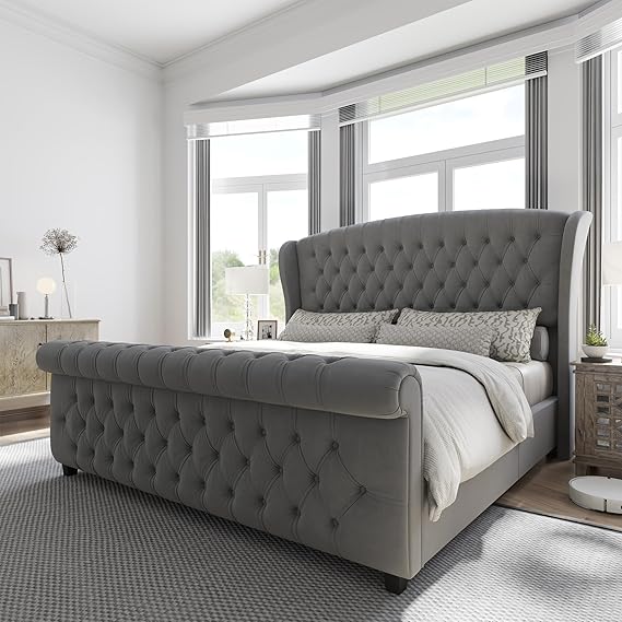 AMERLIFE King Size Platform Bed Frame, Velvet Upholstered Sleigh Bed with Scroll Wingback Headboard & Footboard/Button Tufted/No Box Spring Required/Grey