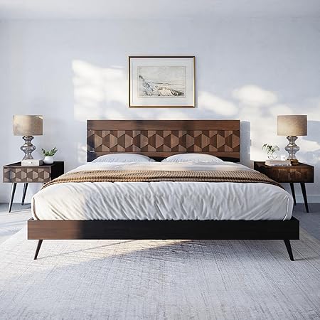 Bme Georgina Signature Bed Frame with Handcrafted Geometric Headboard, Mid Century Modern, Solid Acacia Wood, No Box Spring Needed, 12 Strong Wood Slats Support, Easy Assembly, Walnut, King