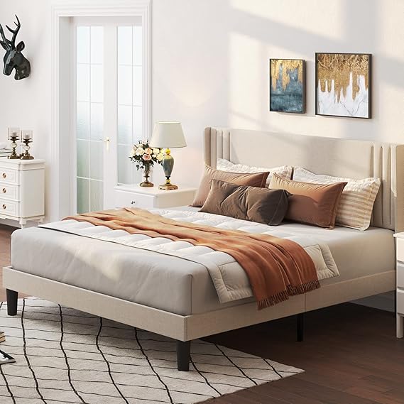 Gizoon Queen Bed Frame with Wingback Headboard, Upholstered Platform Bed with Modern Geometric Headboard, Wooden Slats, Noise-Free, No Box Spring Needed