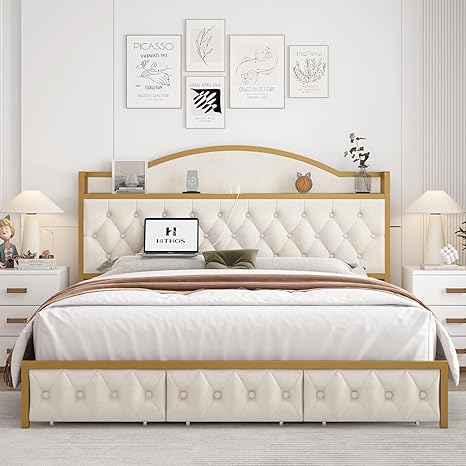 HITHOS King Size Bed Frame, Storage Headboard with Charging Station, Button Tufted Platform Bed with 3 Drawers, Upholstered Bed with 51.6" Tall Headboard, Gold Metal Frame, No Box Spring Needed, Cream