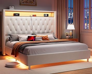 Jocisland Bed Frame with LED Lights and Charging Station, Velvet Tall Upholstered Platform Bed Wingback Headboard, No Box Spring Needed (Cream-Include Motion Lights Under Bed, King)