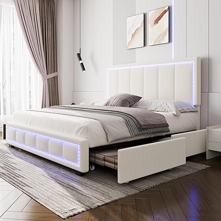 King Size Bed Frame, Upholstered LED Bed Frame with 4 Storage Drawers, Platform Bed with Adjustable Headboard, Solid Wooden Slats Support, No Box Spring Needed, Off White
