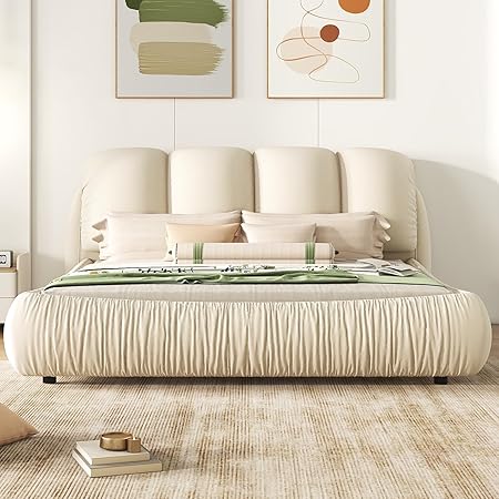King Size Platform Bed Luxury Upholstered Bed with Thick Headboard Velvet King Bed Frame with Oversized Padded Backrest for Bedroom, No Box Spring Needed (Beige)