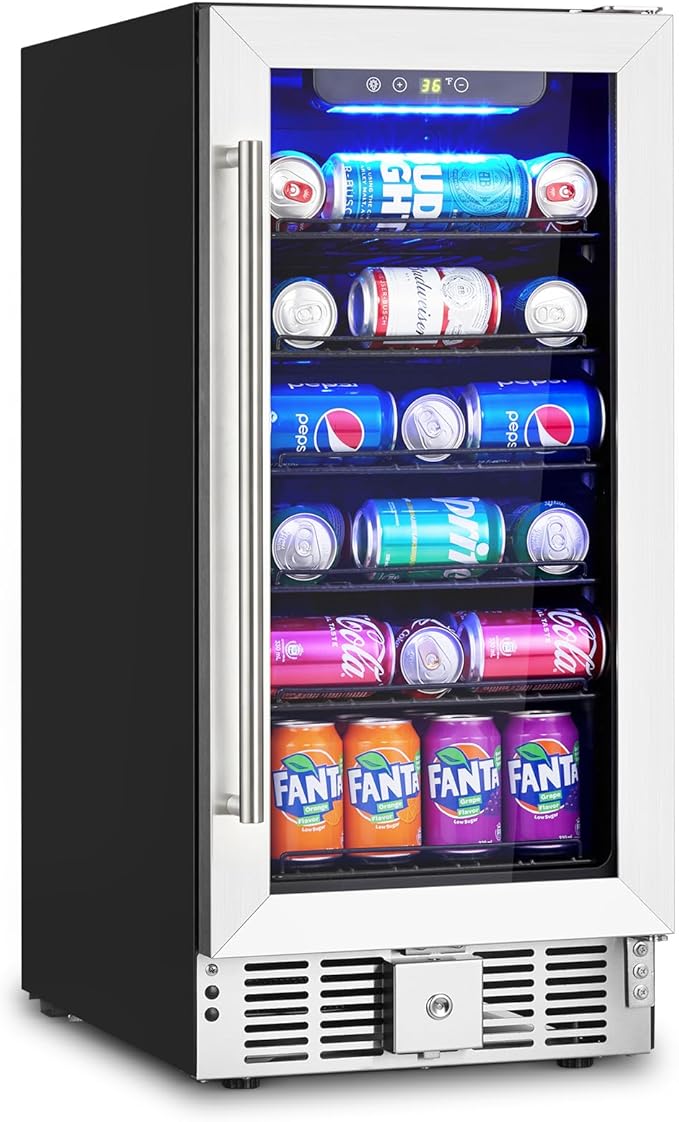 15 Inch Beverage Refrigerator Cooler, 110 Cans Beverage Fridge Built-in LED Light and Freestanding with Glass Door Beer Wine Drink Soda Fridge for Bar, Kitchen, Office (110 cans)