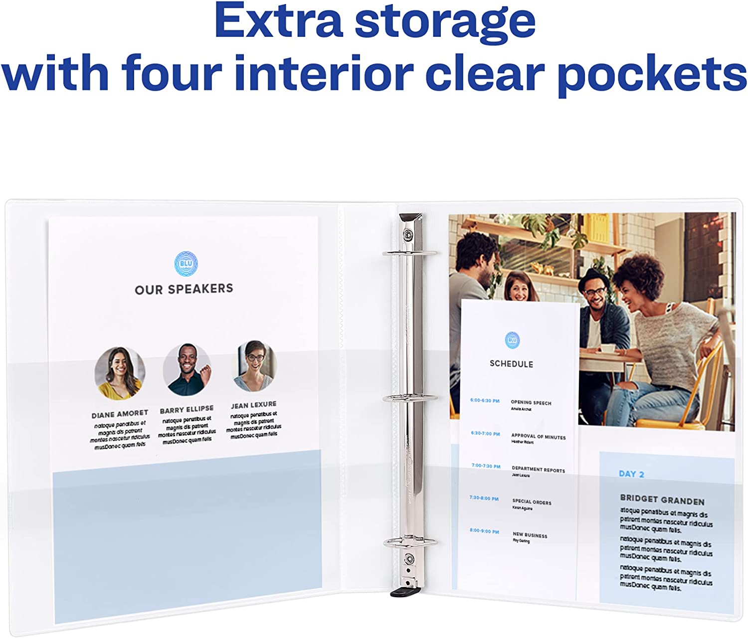 The interior of this binder is just as impressive as its exterior. With back-mounted EZD rings, your pages will never curl again. Pages lay flat and are easy to turn, while the cover opens and closes without pulling on your papers. The One Touch EZD-rings lock securely but release at the touch of a button. Enjoy extra organization and storage capabilities with four interior clear pockets made of nonstick material that won't lift or transfer ink from your documents.