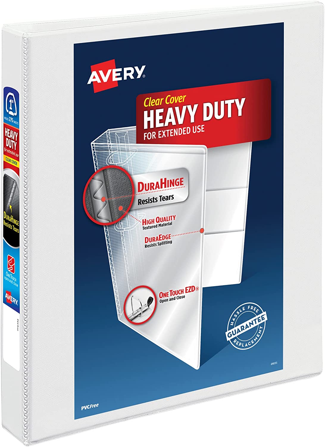 If you're looking for a binder that is stronger, lasts longer, and can hang tough with even the most demanding activities, look no further than this Avery Heavy Duty 1 inch binder in white. Its sturdy exterior features a tear-resistant spine (DuraHinge) and more flexible, split-resistant edges (DuraEdge). Heavy Duty binders are also fully adhered with a deep-weave polypropylene cover that is resistant to bubbling, surface wrinkles, and is tear-resistant.