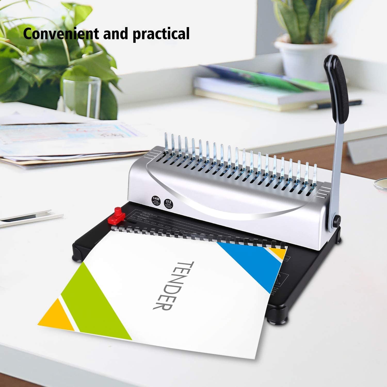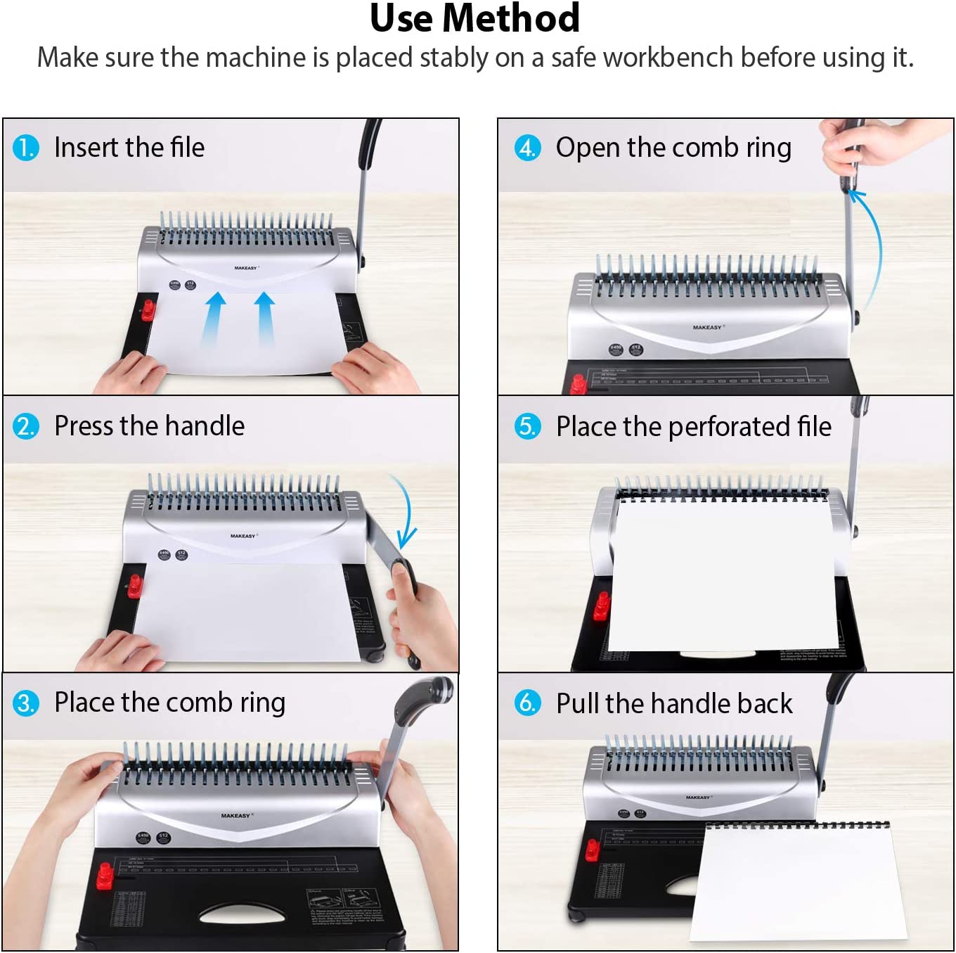 • 【Great Value for Money】Our binding machine come with 100pcs of 3/8'' black 21-ring PVC comb bindings in the package ----- ➤Max binding capacity: 450 sheets (with 2'' comb plastic bindings ) ----- ➤Max punch capacity: 10-12 sheets(Paper Thickness: 80g(≤20lb) paper) Note: If you use paper of other thickness, please reduce the paper according to the actual situation!