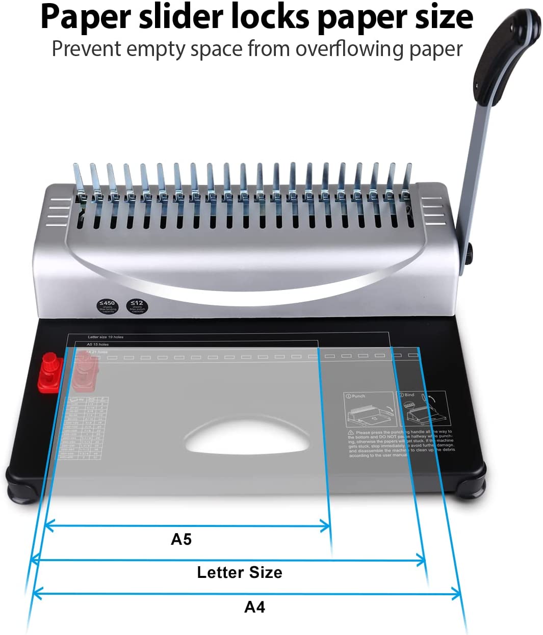• 【Marks of A4/A5/Letter Size & Adjustable Edge Guide】This UPGRADED comb binding machine is suitable for Letter Size (19 holes), A4 Size (21 holes), A5 Size (15 holes). Enhanced accuracy edge guide from 3mm to 5mm for pinpoint punching. Adjustments can be made with ease.