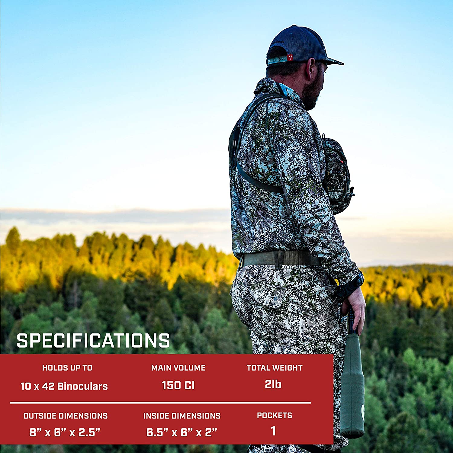 • Technical Specs - fits most binoculars up to 8 x 42; Weighs 1 lb. (0.45 kg) and measures 8 x 6 x 2.5 inches; interior volume is 150 cubic inches (2.5 L); stealthy approach pattern Came and ultralight rip stop nylon fabric