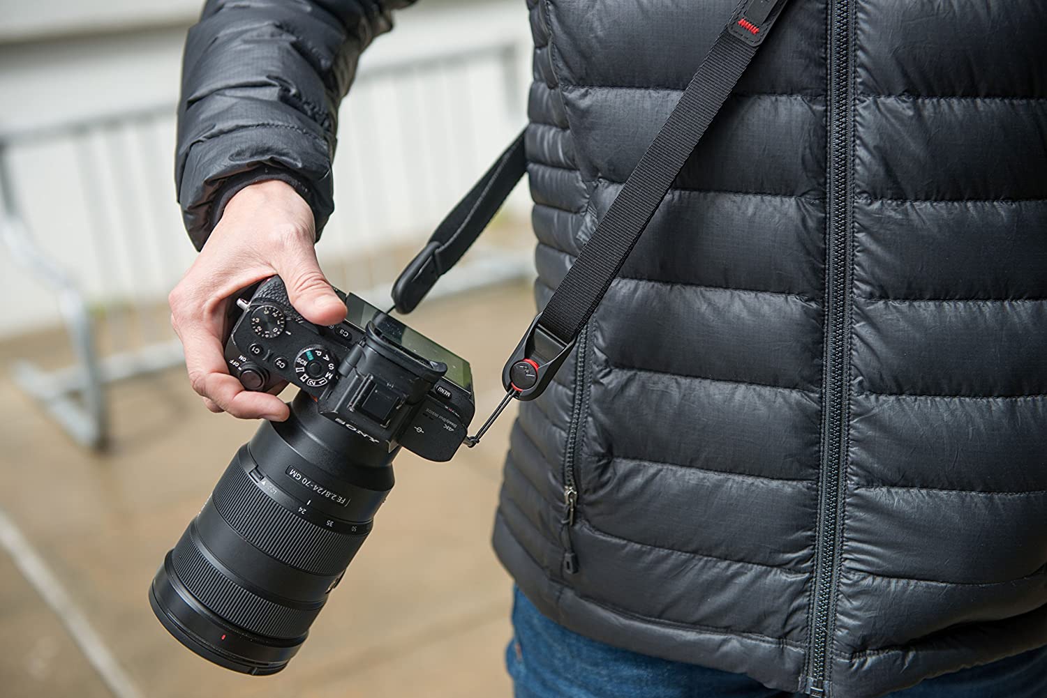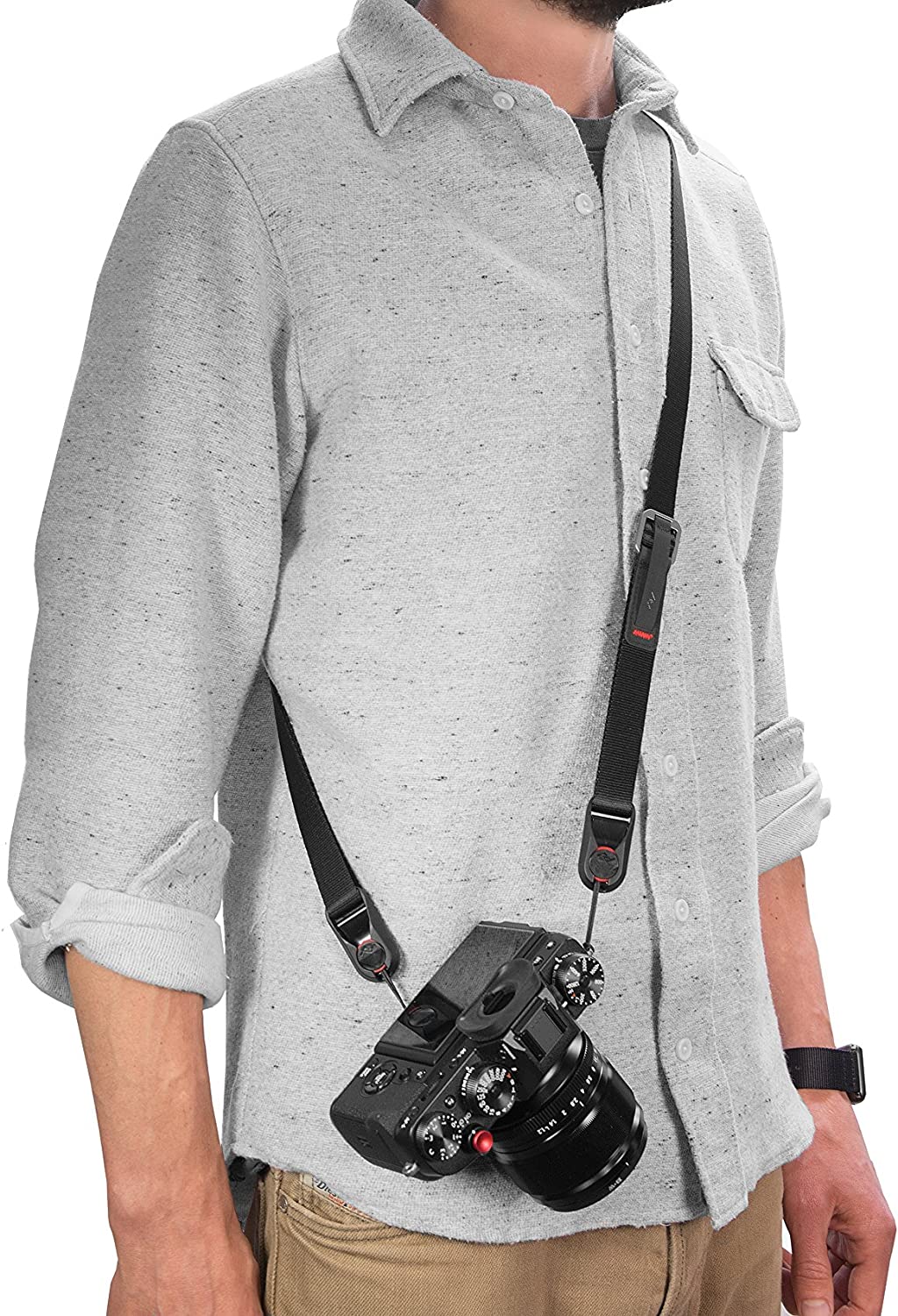 • Smooth seatbelt-style webbing glides over clothing for fast camera access and all-day comfort.