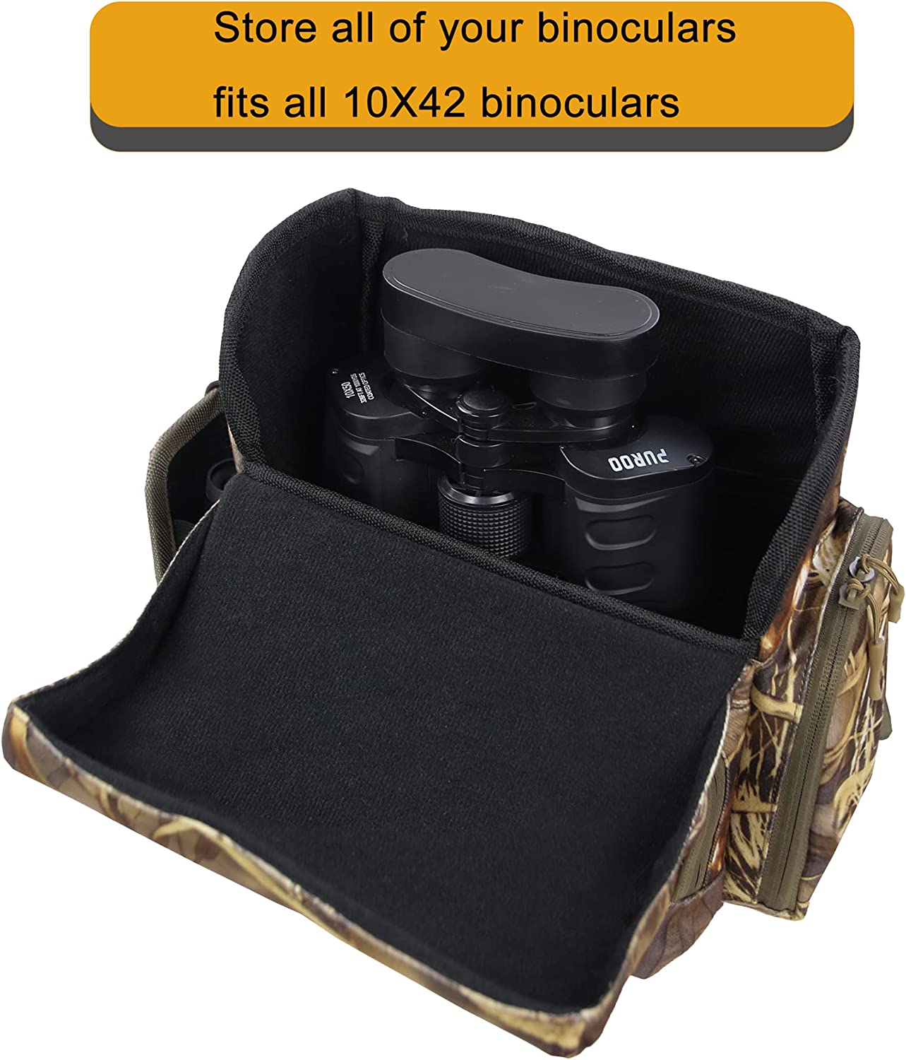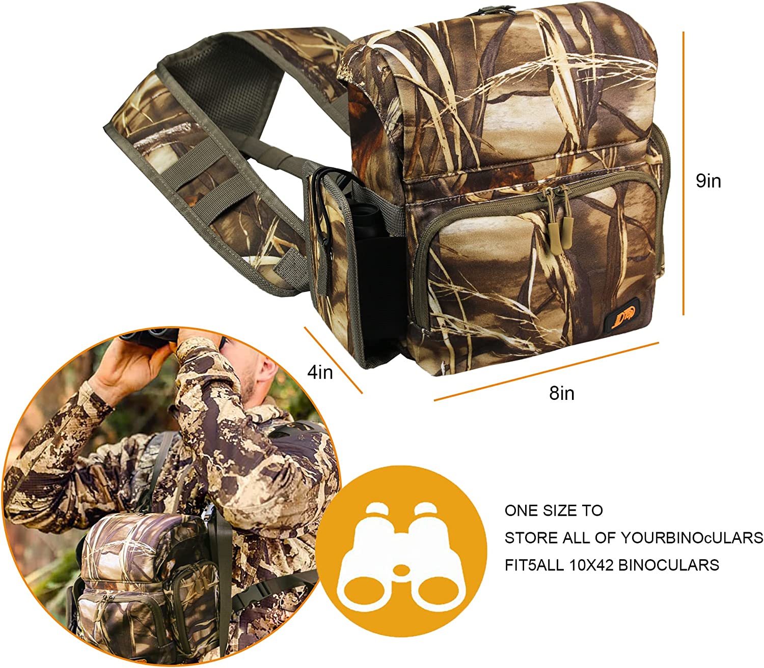 • High Quality & Well Designed : This camo binoculars include 3 spacious pockets. This binoculars case have a big pocket in front for storing a bow release or extra ammo, a side pocket for knife or ammo, & a back, quick-access phone pocket.