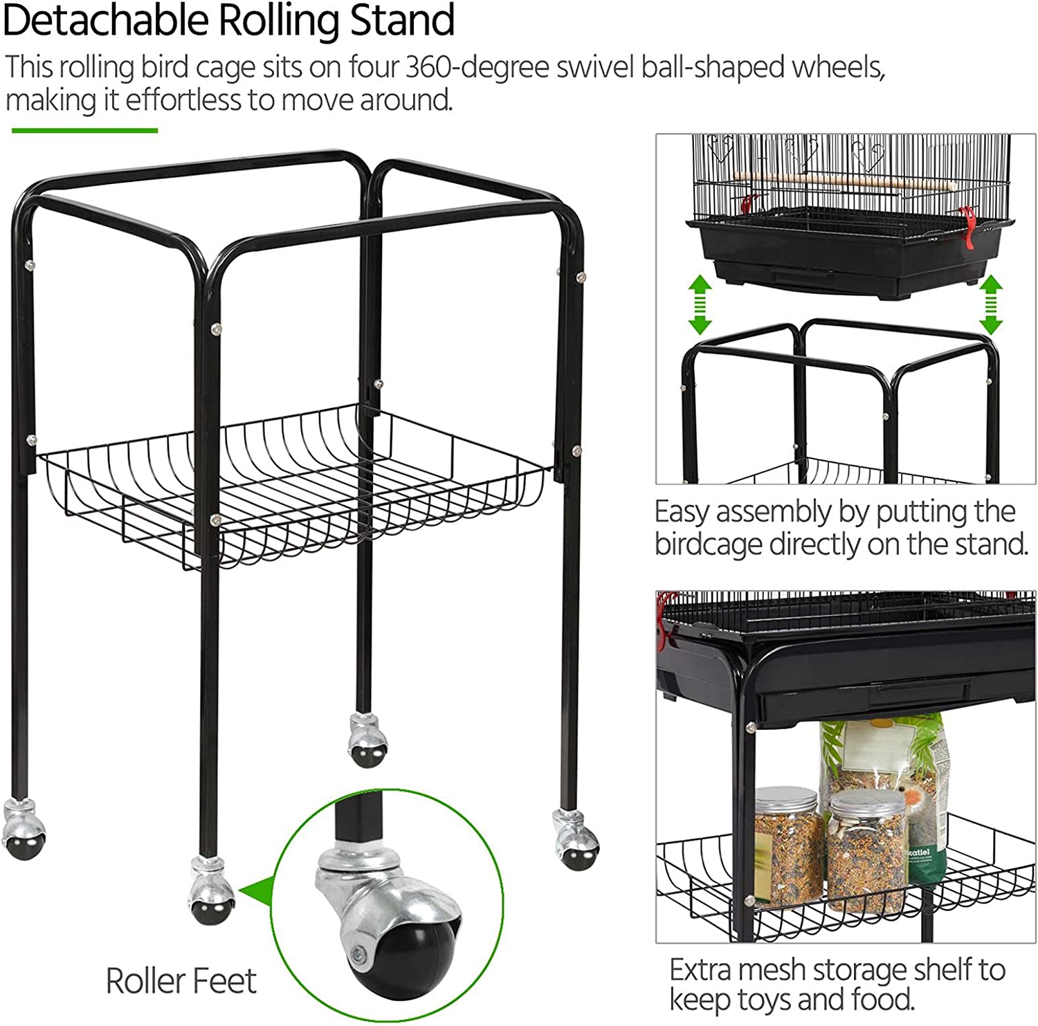 • ?【Detachable Rolling Stand】This rolling bird cage sits on four 360-degree swivel ball-shaped wheels, making it effortless to move around. The upper cage can be used separately thanks to the detachable design. You can place/carry the cage without the stand at will.