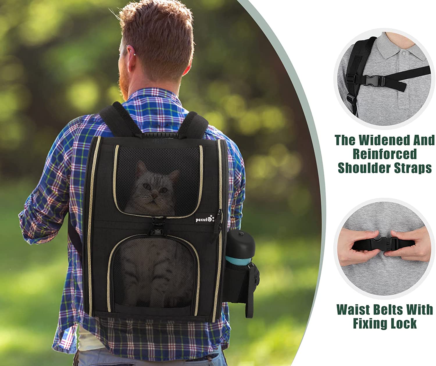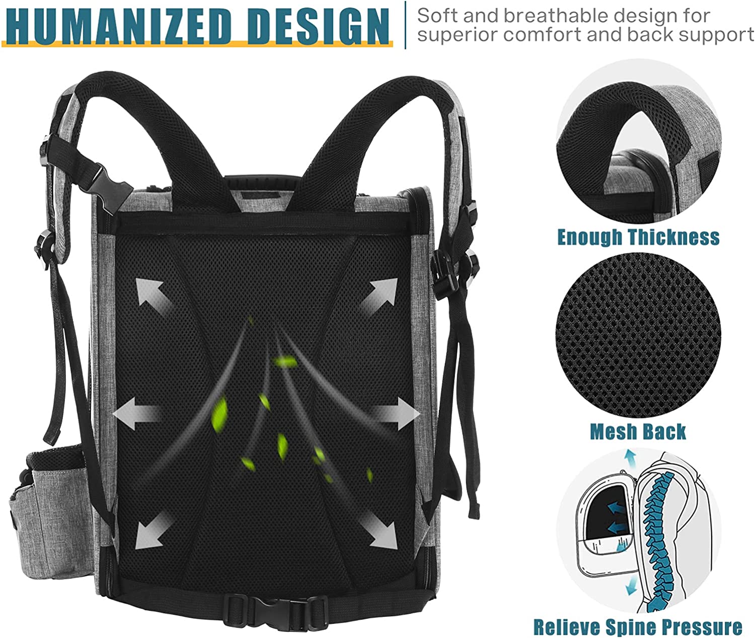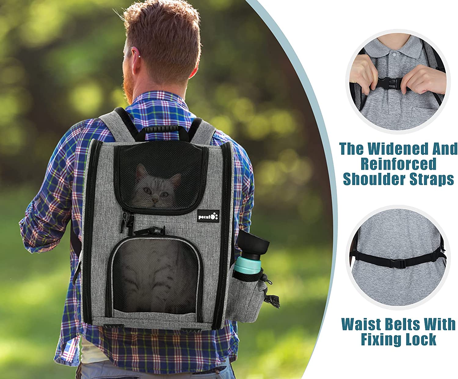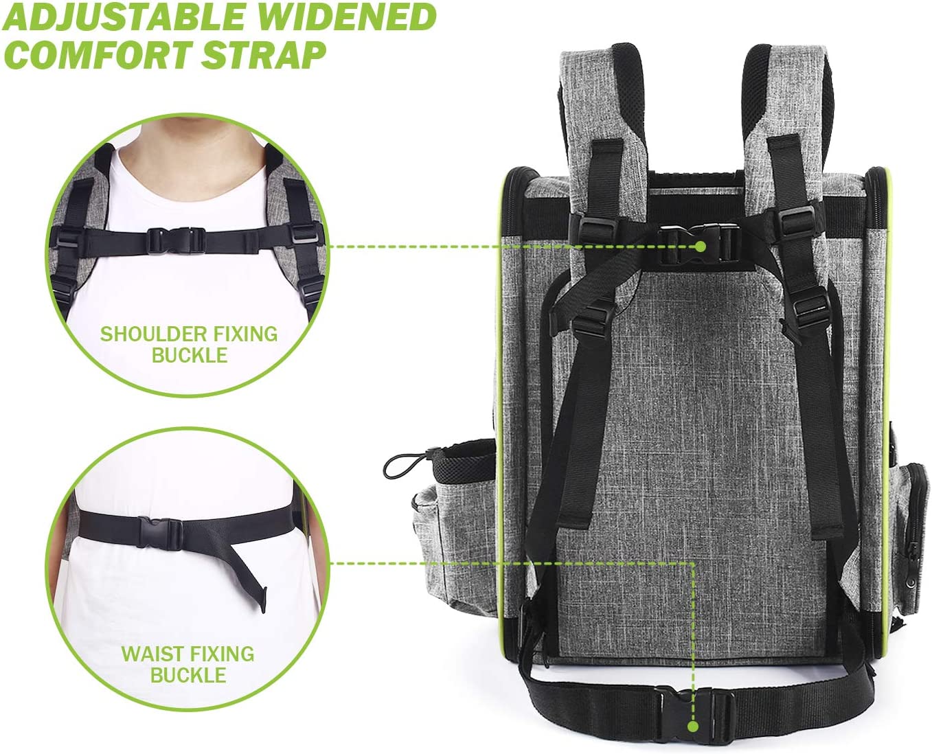 • ? 【 ERGONOMIC DESIGN 】: The widened & padded shoulder straps and back provide support and help reduce load and increase comfort. 2 retractable buckles on the top and bottom of the cat backpack to prevent shoulder strap deviation and maintain the stability of the dog carrier.