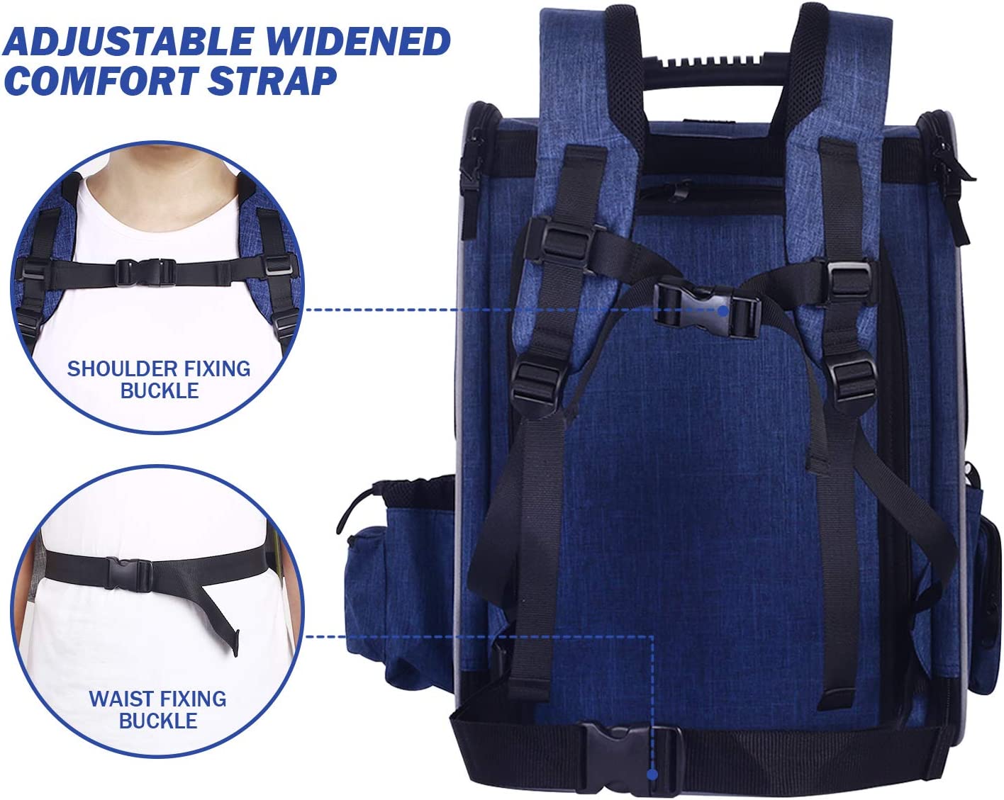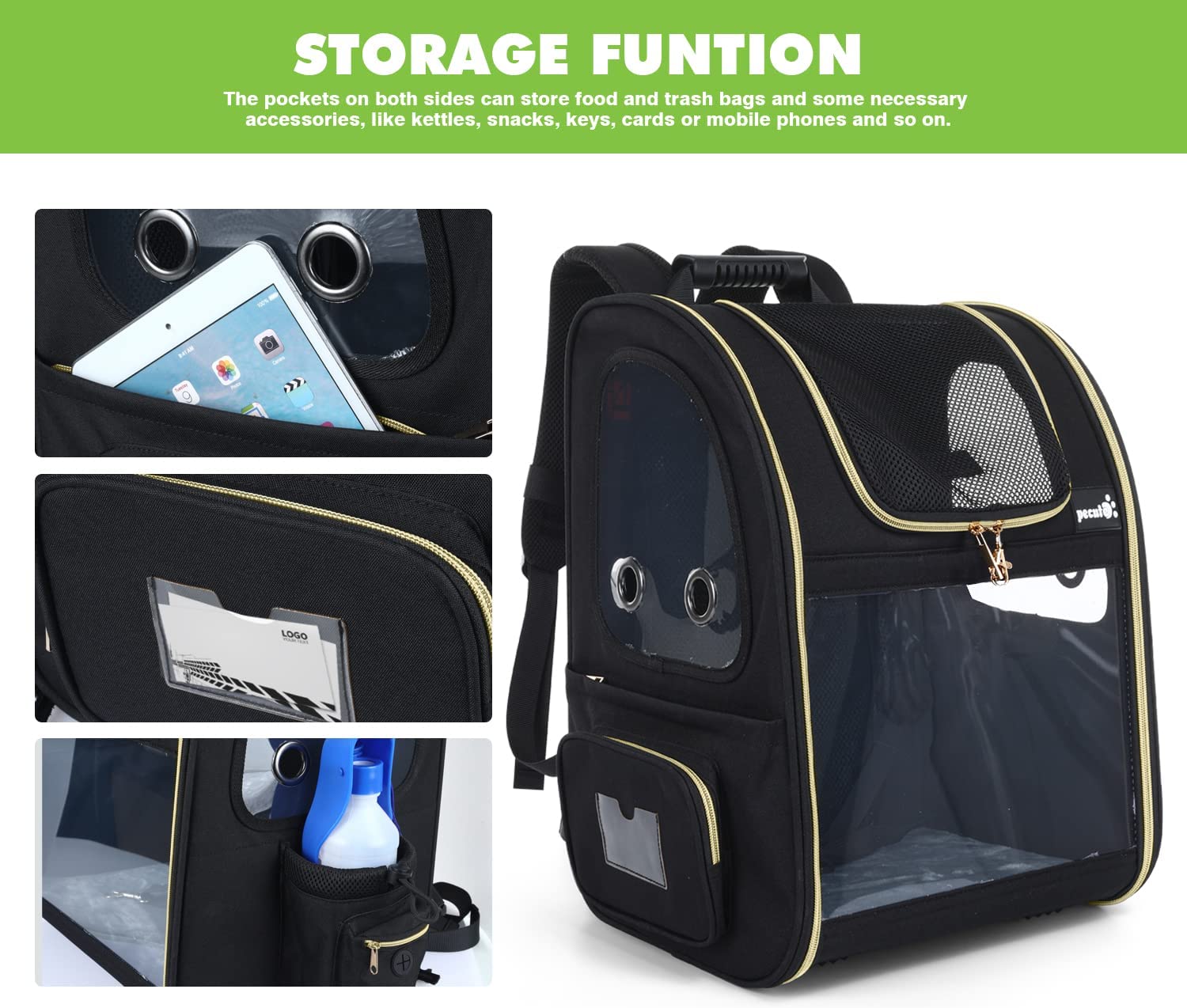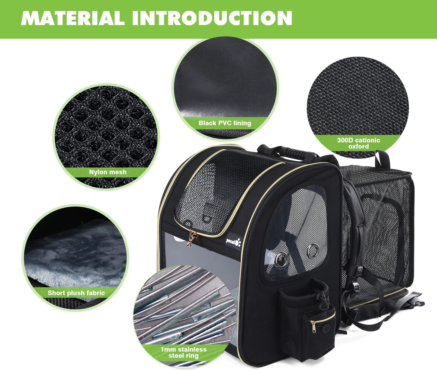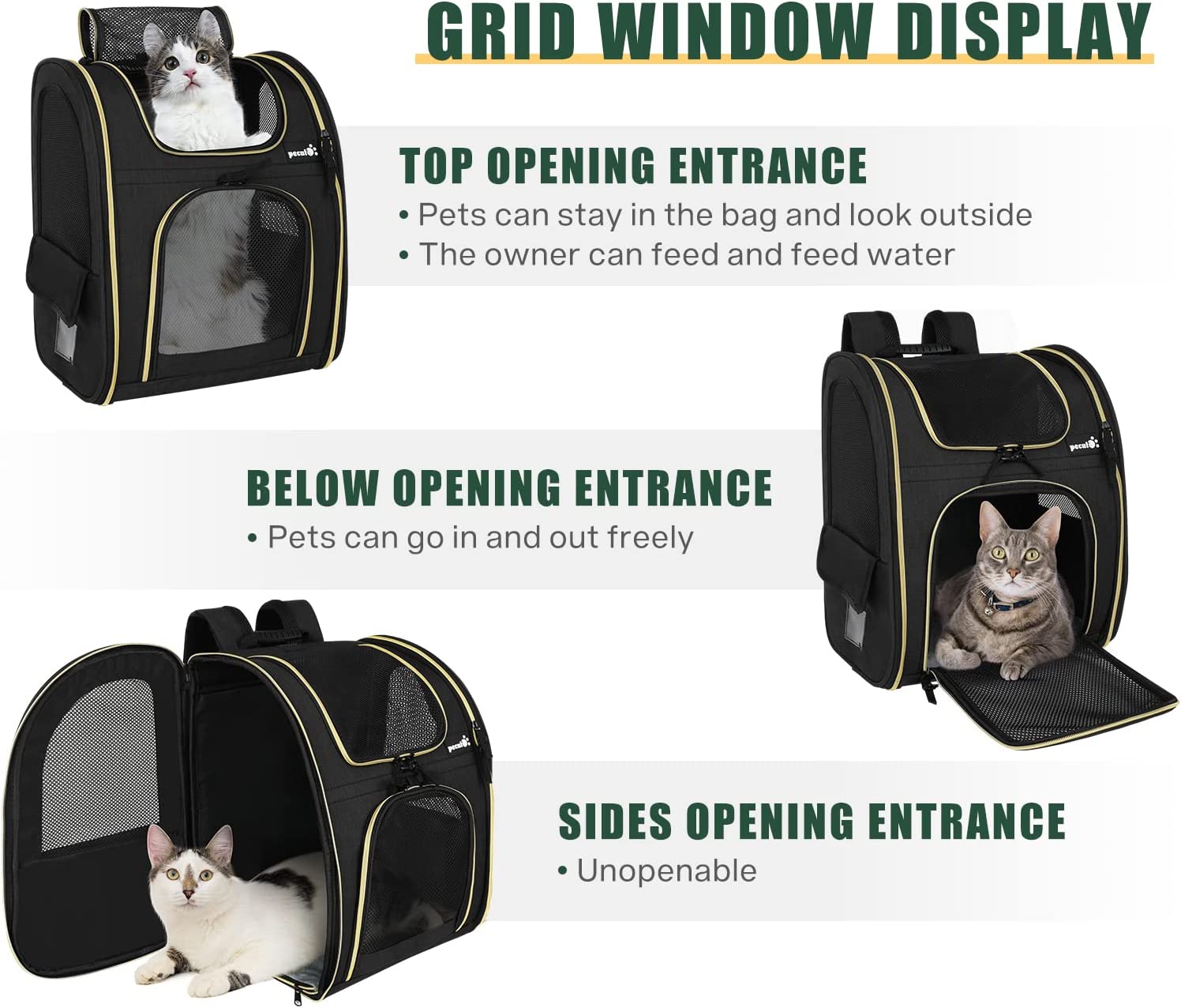 • ? 【 ERGONOMIC DESIGN 】: The widened & padded shoulder straps and back provide support and help reduce load and increase comfort. 2 retractable buckles on the top and bottom of the cat backpack to prevent shoulder strap deviation and maintain the stability of the dog carrier.