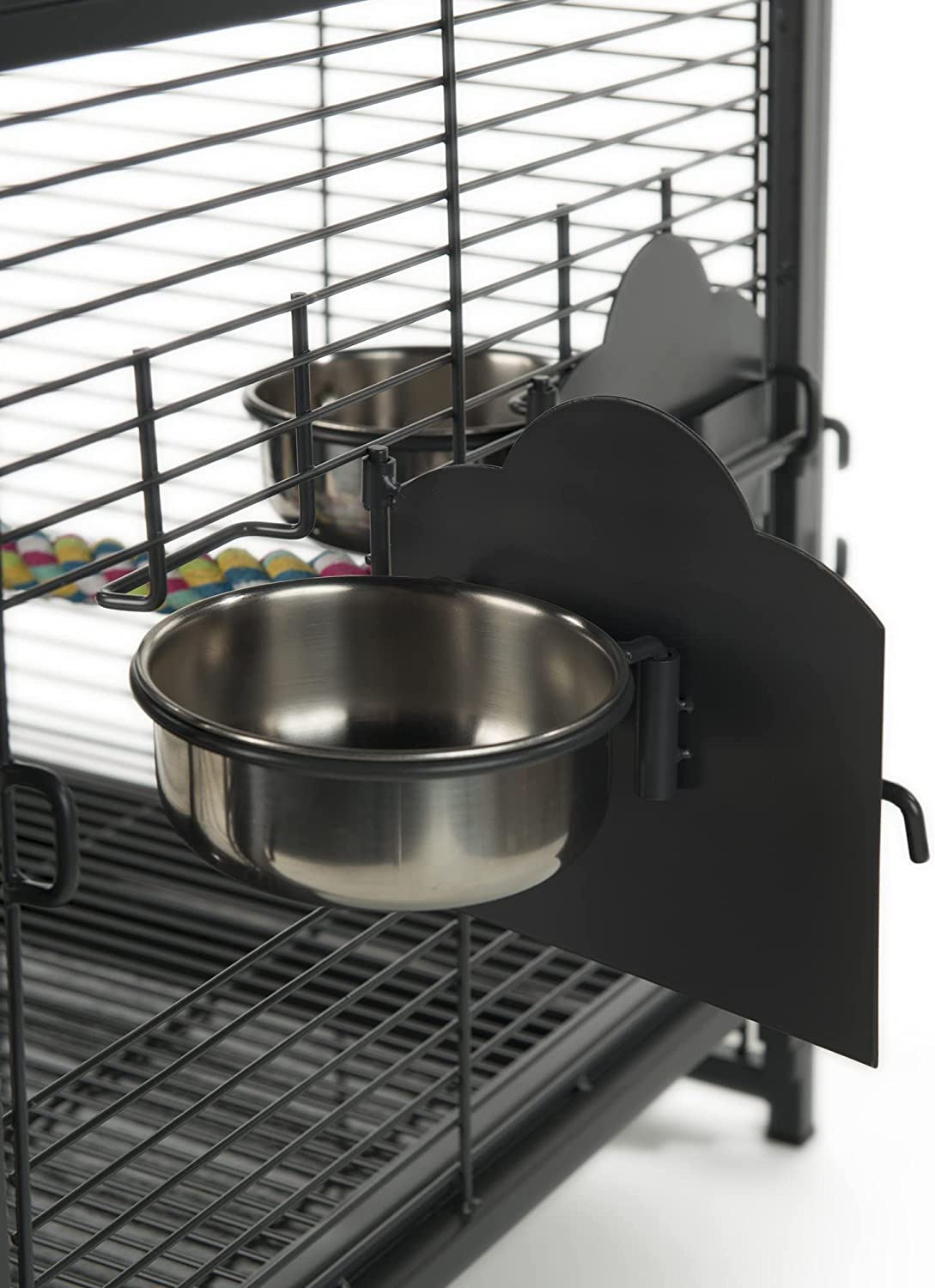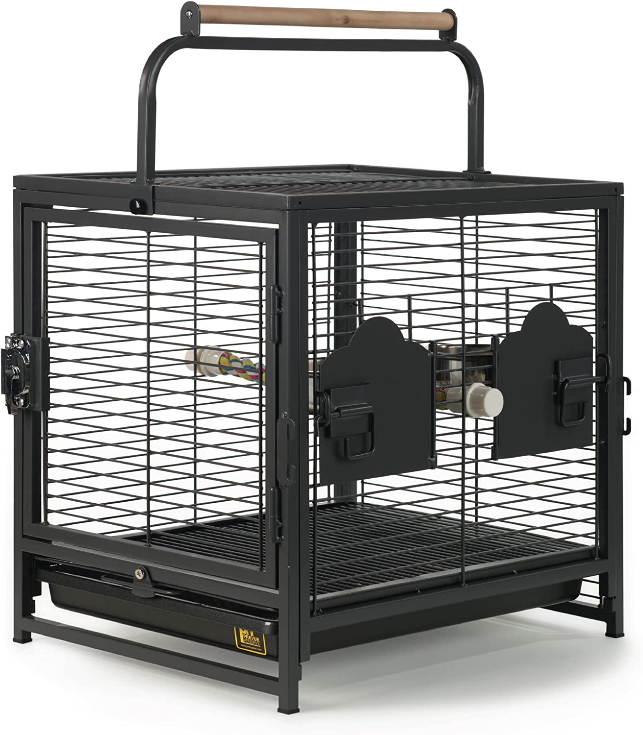 Our small travel carrier for birds is ideal for short term use while traveling, making vet visits, or emergencies. The powder coated steel is rust resistant, and the small pet cage design is sturdy. Our portable birdcage is lighter than many other travel cages on the market and includes bird conveniences inside and out. This travel cage includes one foot-friendly shapeable rope perch for inside the cage plus a wooden perch playtop on the roof. The play top also works as the travel cage handle. Inside, solid cup doors prevent spilling while the lock-in-place cups won’t be dislodged by your bird. The removable tray is held in place by a windbell grille tray lock so it won’t slide out during travel but pulls out easily for cleaning. Our short-term black cage is easy to use and clean. The innovative welded bracket seatbelt collars allow you to buckle the carrier into your car for secure automotive travel. Safety features include a bird proof door lock to prevent your small, medium, or large sized bird from escaping. Our bird carrier crate is expertly engineered for easy assembly with no additional tools required. This small bird cage measures 18 ¾ inches long x 14 ⅞ inches wide x 18 inches high (25 inches high to top of play top) with ½ inch wire spacing. Established in 1869, we’re on a quest to improve pet living and the pet ownership experience. Prevue creates stylish, functional, reliable, and pet-friendly products for domesticated animals and their families. Our products and accessories include toys, activity centers, crates, kennels, cages, and more. Simplify your life while improving your pet’s - with Prevue.