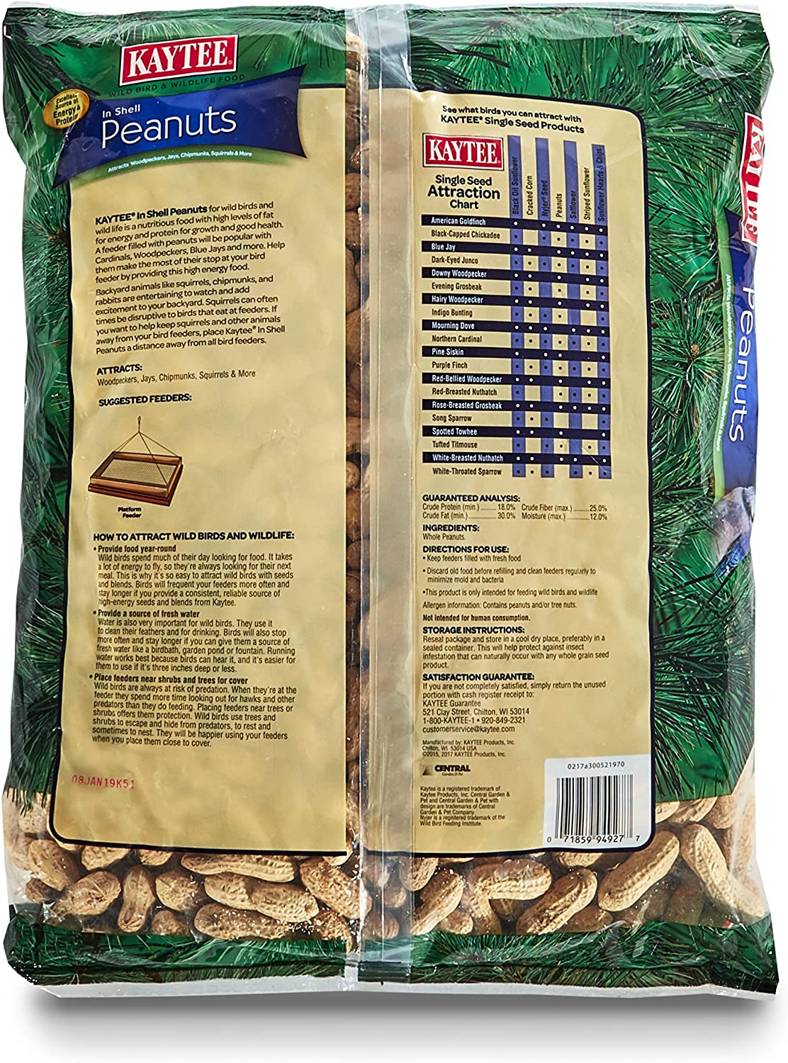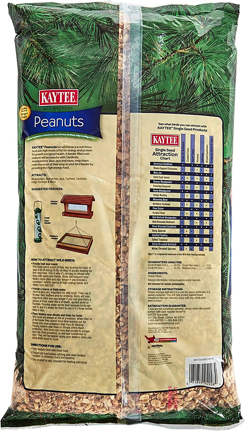 Kaytee Peanuts for wild birds is a nutritious food with high levels of fat for energy, and protein for growth and good health. A feeder filled with peanuts will be popular with Cardinals, Woodpeckers, Blue Jays and more.