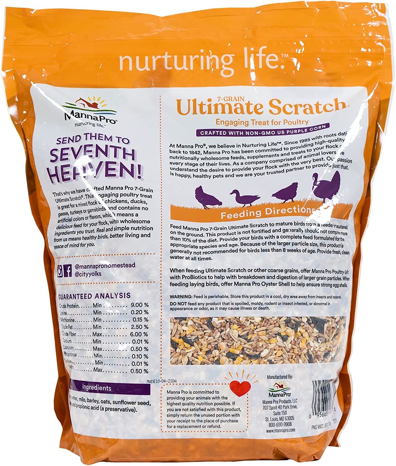 At Manna Pro, we believe in Nurturing Life. Since 1985 with roots dating back to 1842, Manna Pro has been committed to providing high-quality, nutritionally wholesome feeds, supplements and treats to your flock at every stage of their lives. As a company comprised of animal lovers we understand the desire to provide your flock with the very best. Our passion is happy, healthy pets and we are your trusted partner to provide just that. That’s why we have crafted Manna Pro Ultimate Scratch. This engaging poultry treat is great for a mixed flock of chickens, ducks, geese, turkeys or gamebirds and contains no artificial colors or flavors, which means a delicious feed for your flock, with wholesome ingredients you trust. Real and simple nutrition from us means healthy birds, better living and peace of mind for you.