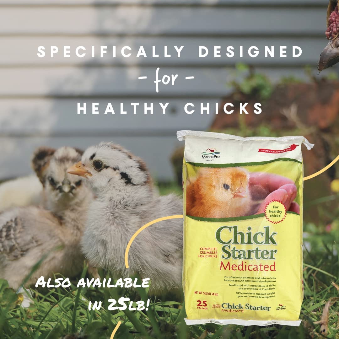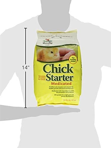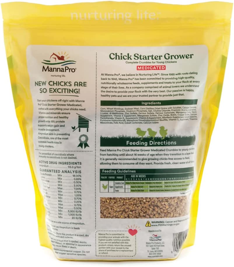 Manna Pro Chick Starter Medicated Crumbles is a complete feed formulated for the development of active immunity to Coccidiosis and for increased rate of weight gain and improved feed efficiency in replacement chickens.