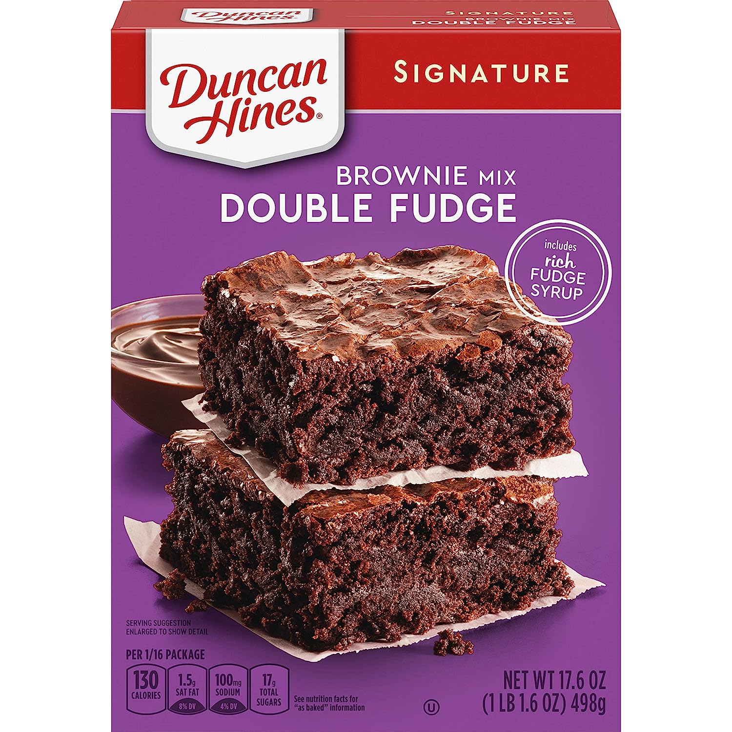 Indulge in extra fudge flavor with Duncan Hines Signature Double Fudge Brownie Mix. These fudge brownies feature intense chocolate flavor and include a pouch of rich fudge syrup for a moist chocolate dessert. Serve them as birthday brownies by themselves, or add frosting to the chocolate brownies for a special treat. Add eggs, oil and water plus the fudge packet to the mix and bake according to package instructions. This 17.6 ounce box of brownies fits in an 8 by 8 or 9 by 9 inch pan. From brownie mix, to single serve desserts, Duncan Hines has you covered when you’re ready to bake and create.