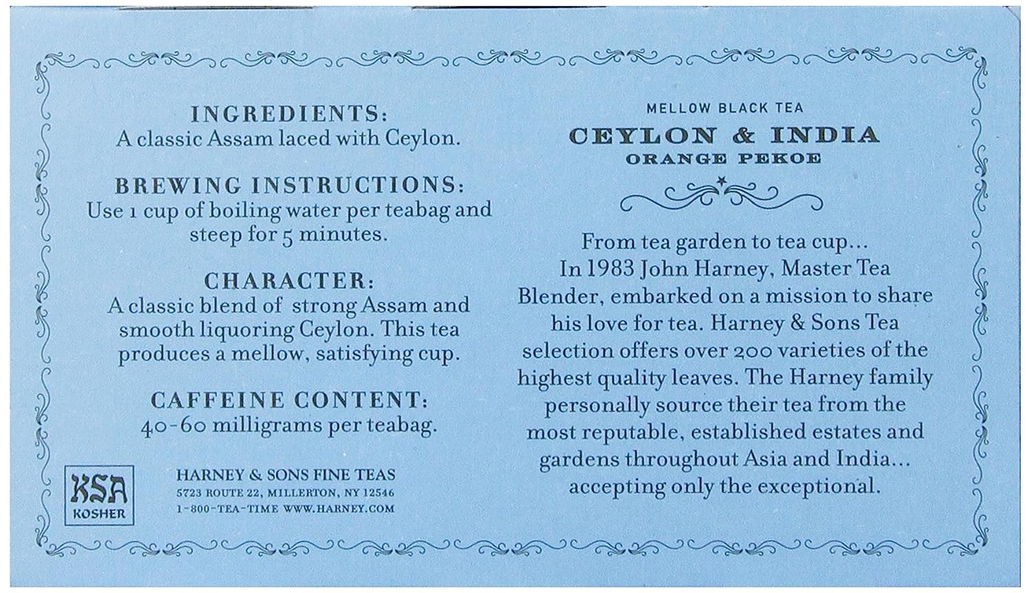 Harney & Sons Decaffeinated Ceylon is high quality black tea with the caffeine removed, but with the depth of flavor left intact. Now you can enjoy your cup of tea without worrying about the caffeine.