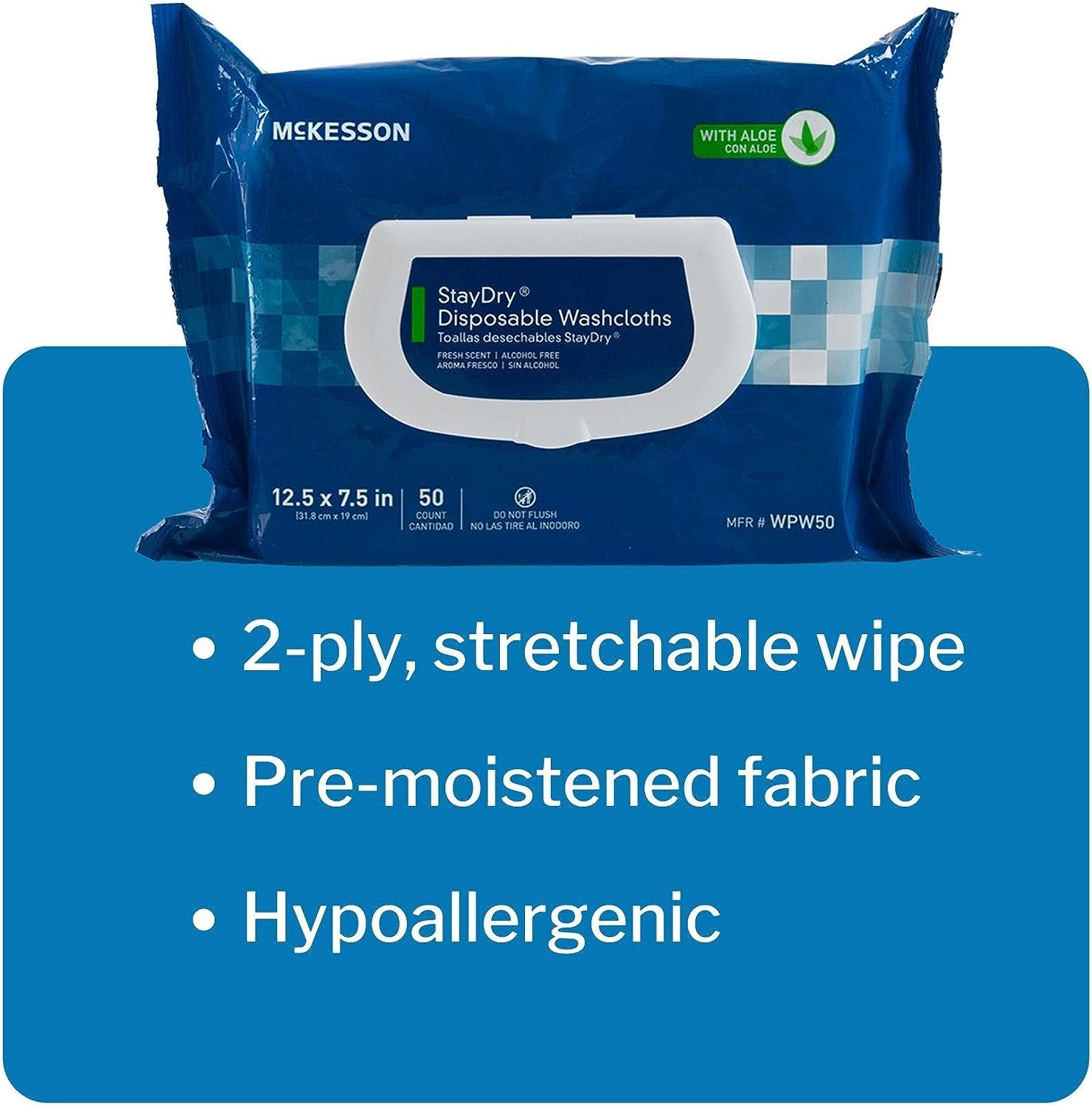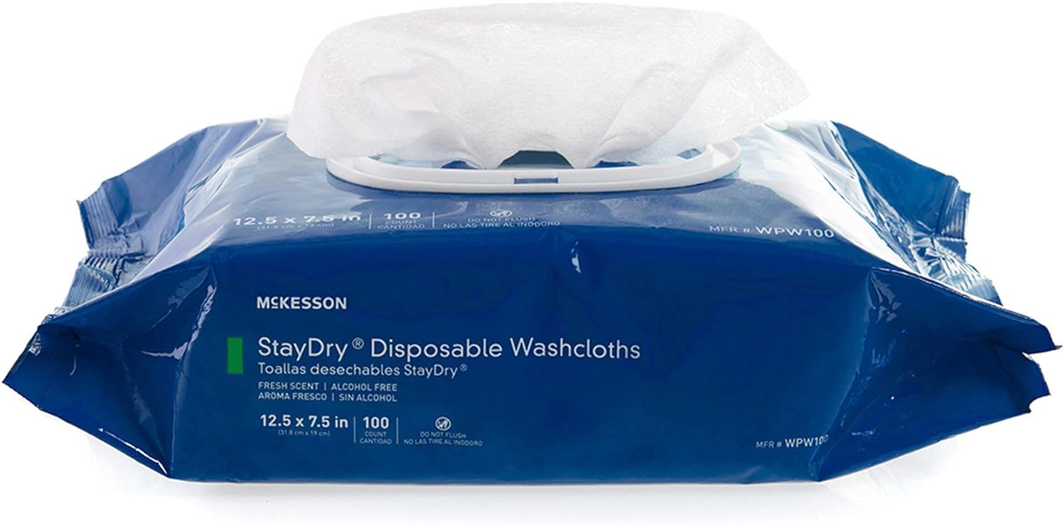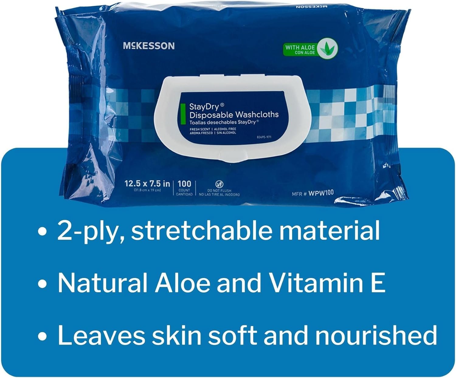 Mfr# WPW100 (1/Pack of 100) - McKesson StayDry Disposable Washcloths with Aloe. 12 Inch x 8 Inch (30.5 cm x 20.3 cm) Pre-Moistened Hypoallergenic Dermatologist Tested. Natural Aloe and Vitamin E. Soft and Strong. Convenient Dispensing Lid. Alcohol-Free. Not made with natural rubber latex. if(typeof P !== 'undefined' && typeof P.when !== 'undefined') { P.when('product-description-fix').execute(function(productDescription){productDescription.fixTableIssue(); }); }