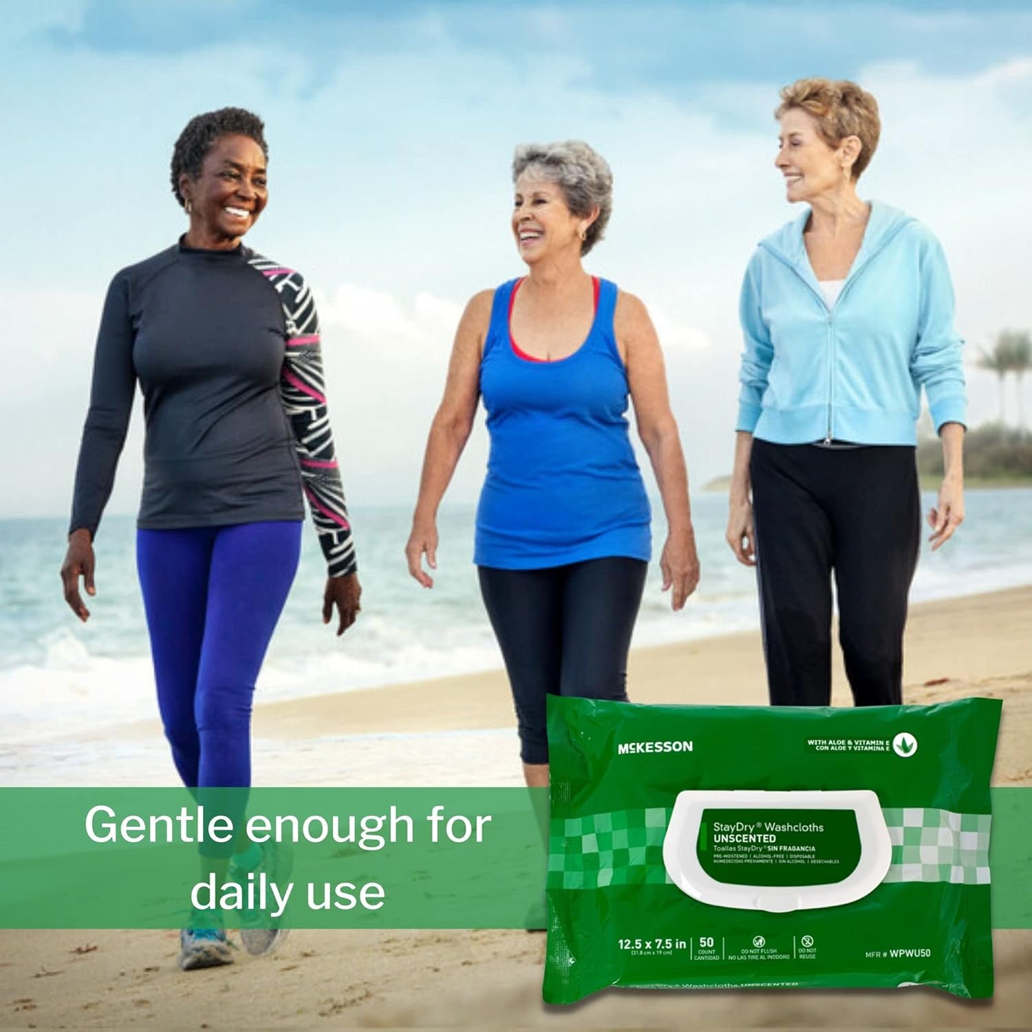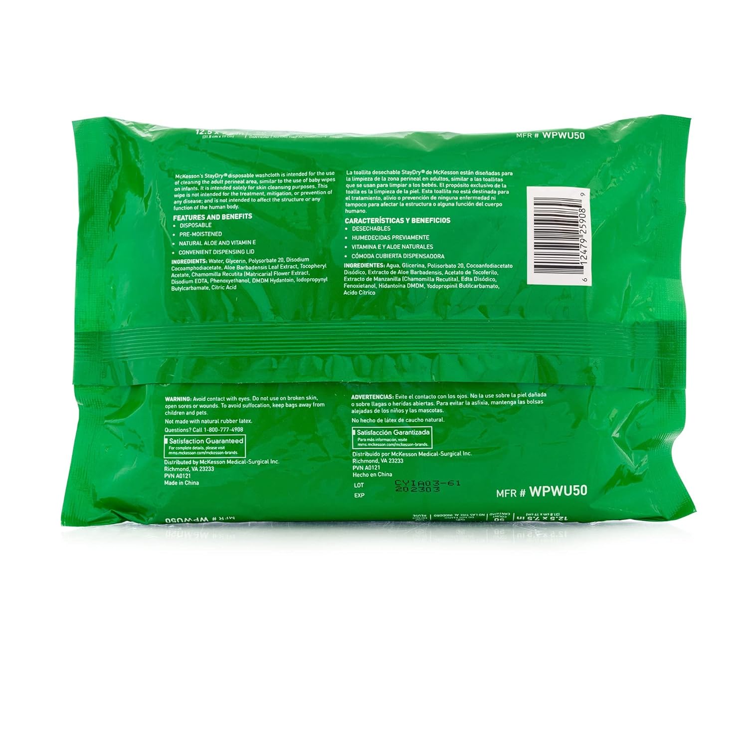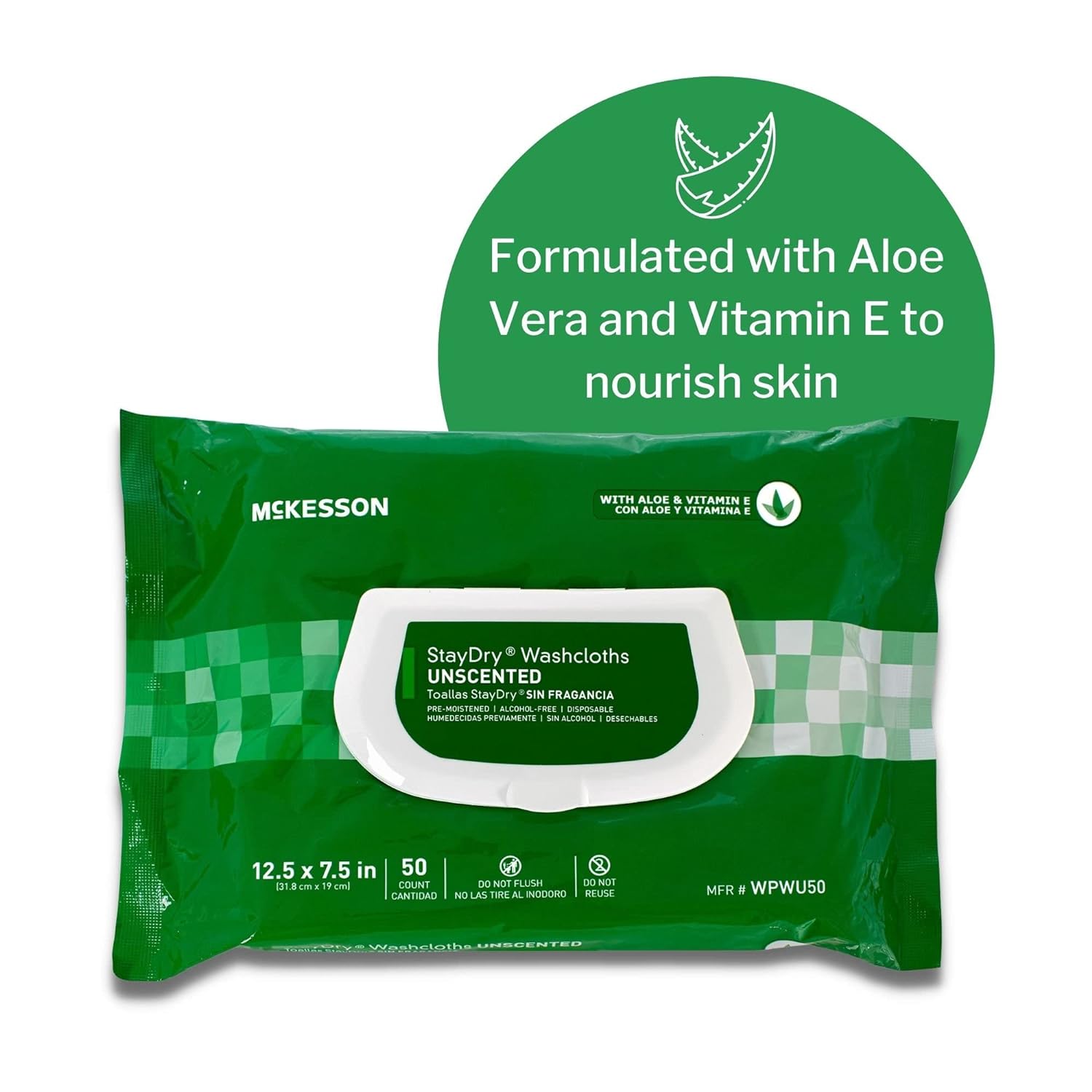 McKesson StayDry Washcloths, Disposable - for All-Over Body Use, Pre-Moistened with Aloe and Vitamin E - Unscented, 7 1/2 in x 12 1/2 in, 50 Count, 12 Packs, 600 Total
