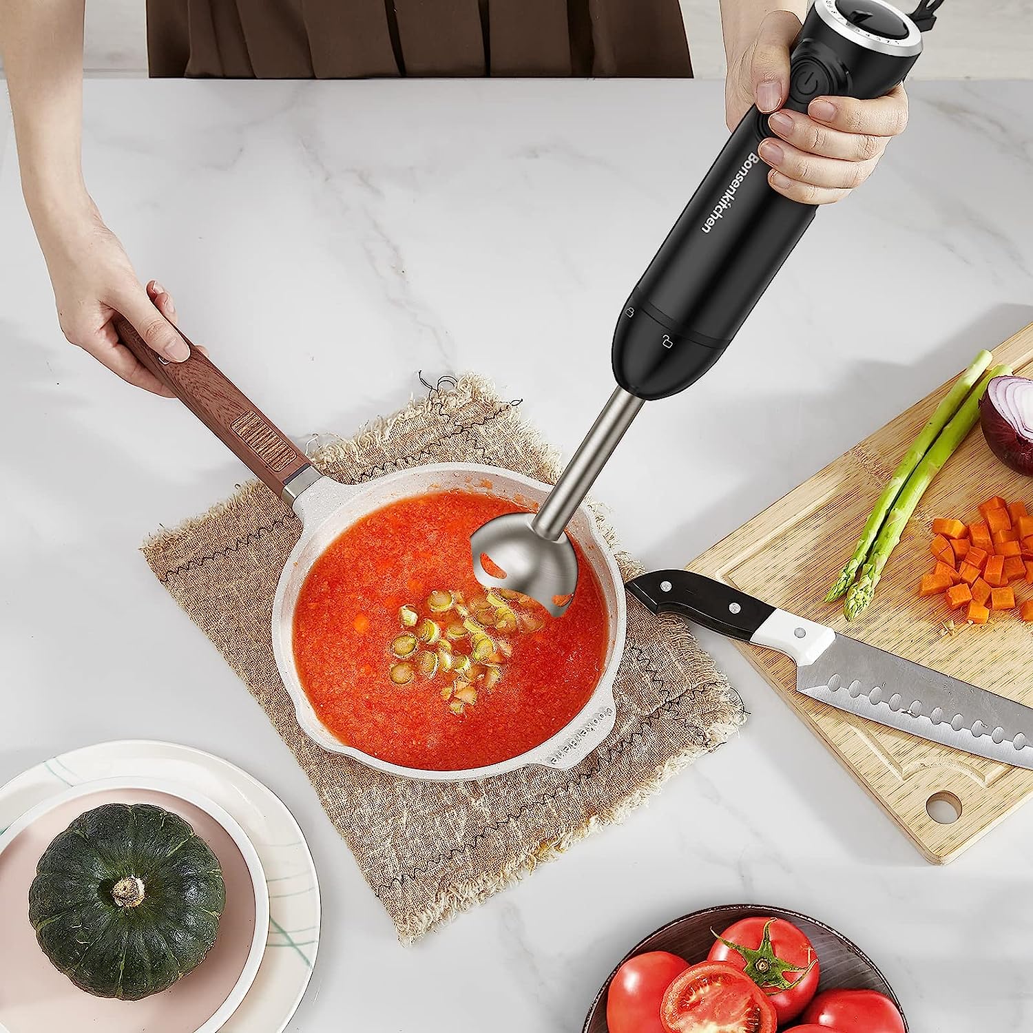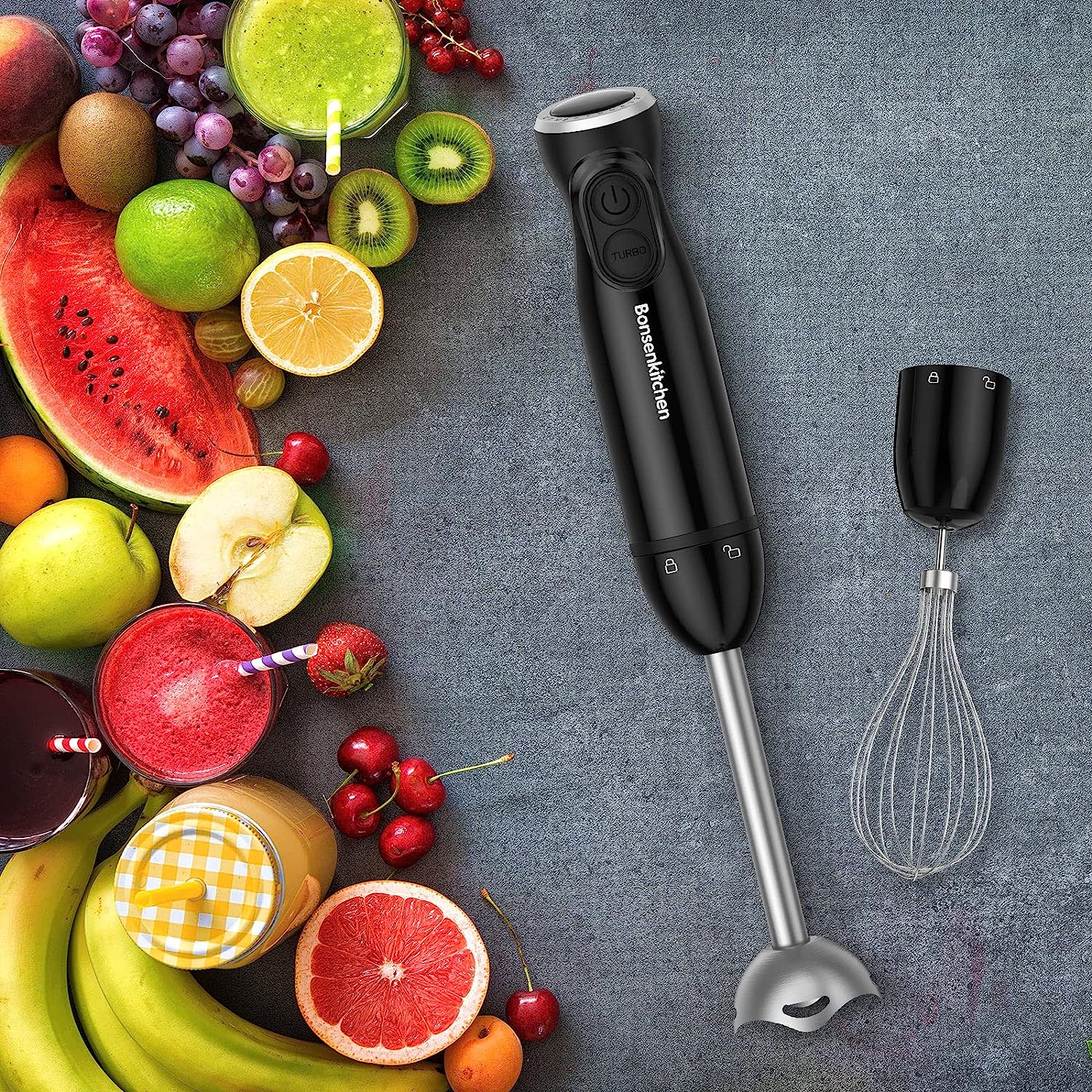 • 【POWERFUL SMOOTH BLENDING】 Bonsenkitchen immersion blender equips with a high-speed 300-Watt motor, it quickly and seamlessly blends ingredients together to make delicious and healthy smoothies, pureed soups, marinades, sauces, juices, and much more. Say goodbye to lumpy sauces and batters and enjoy healthy and delicious meals every day.