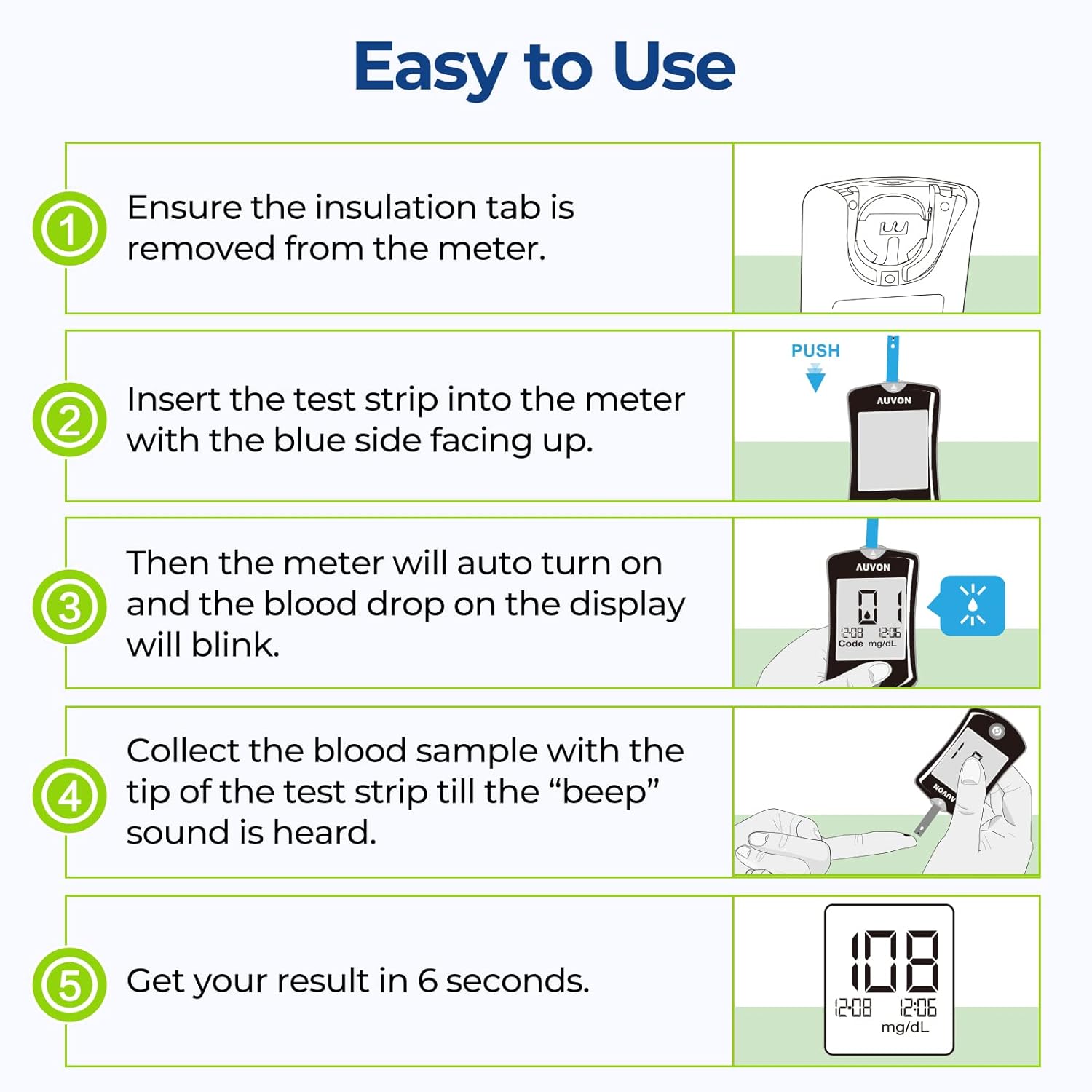 • ALL IN ONE: 1 x AUVON DS-W Blood Glucose Monitor, 1 x battery, 100 x Blood Test Strips, 100 x 30 gauge Lancets, 1 x Lancing device, 1 x Meter User Guide, 1 x Test Strip User Guide, Our Exclusive Lifetime Warranty and Technical Support and Friendly Customer Service.