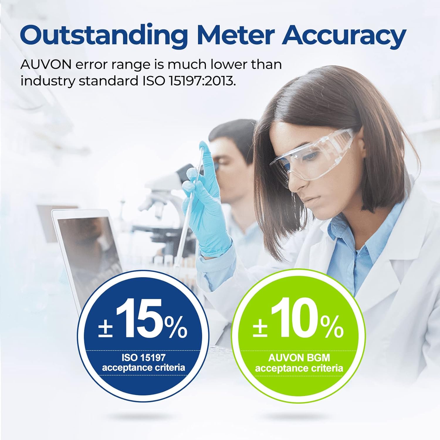 • EXCEEDS INTERNATIONAL STANDARDS. AUVON BGMs can function within ±10%, or ±10 mg/dl of laboratory values over 95% of the time, which is far beyond ISO 15197:2013 passing standard (within ±15% or ±15 mg/dl). The manufacturer is certified with CE mark, GMP, ISO 13485:2016, and ISO 15197:2013 without having any recall on the market in the past 14 years.