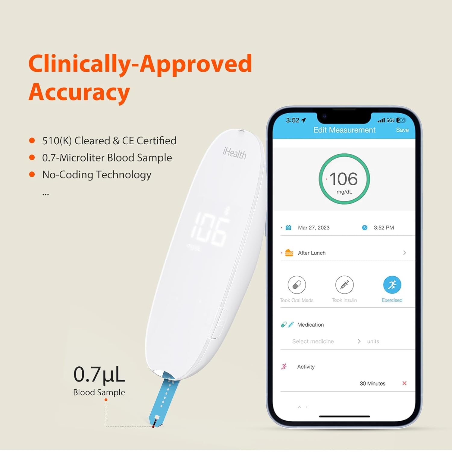 • Never Lose a Reading: Store up to 500 results right on the meter, and unlimited readings when you sync to the free iHealth Gluco-Smart app. With ample built-in memory and seamless app syncing, you'll have the ability to look back on your complete blood glucose history