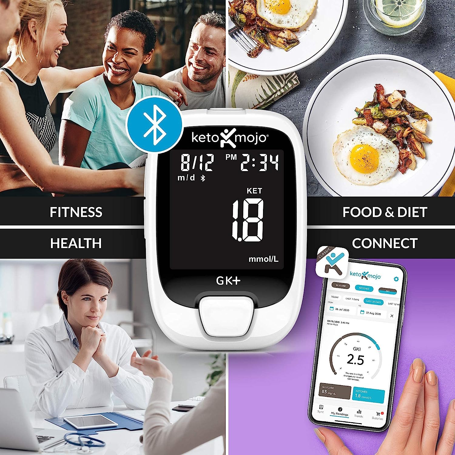 KETO-MOJO GK+ Bluetooth Glucose & Ketone Testing Kit + Free APP for Ketosis & Diabetes Management. 20 Blood Test Strips (10 Each), Meter, 20 Lancets, Lancing Device, and Control Solutions