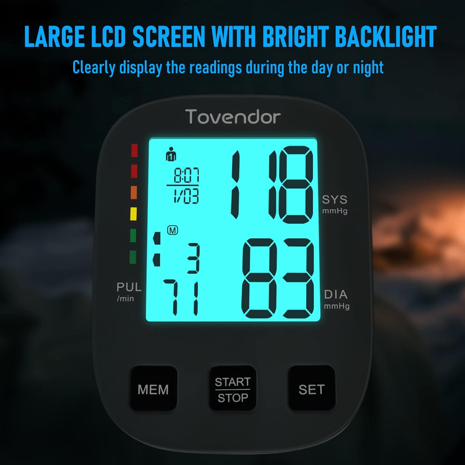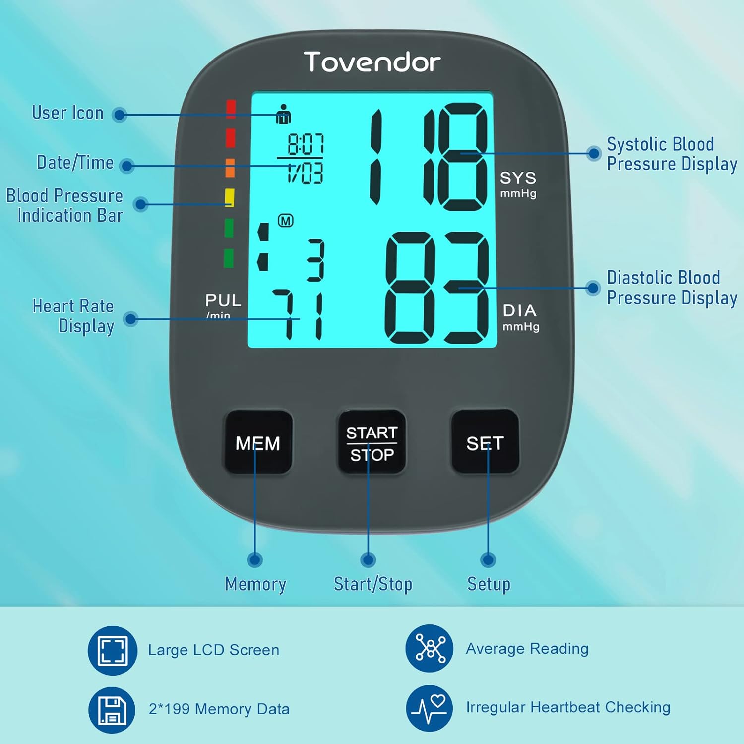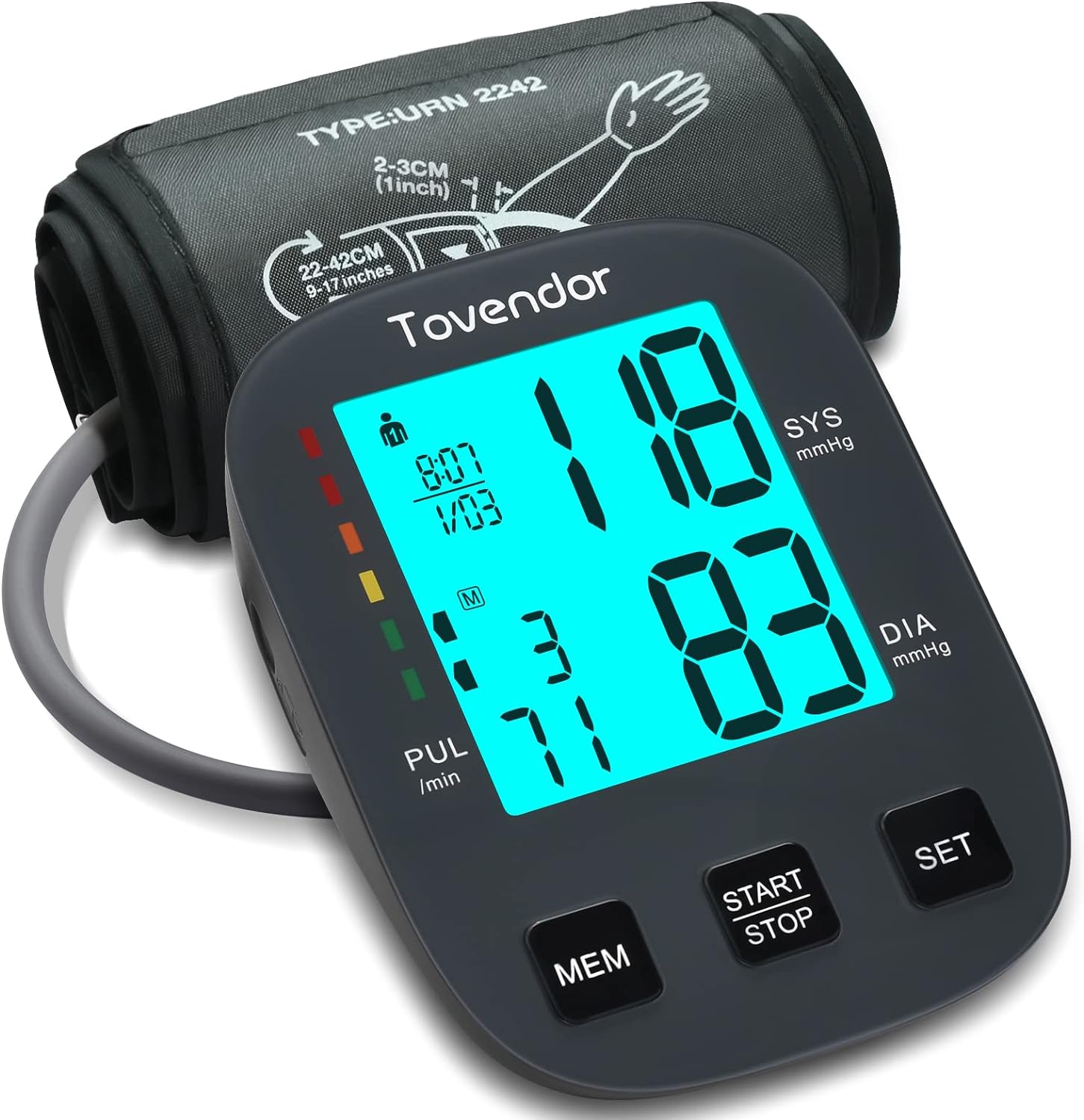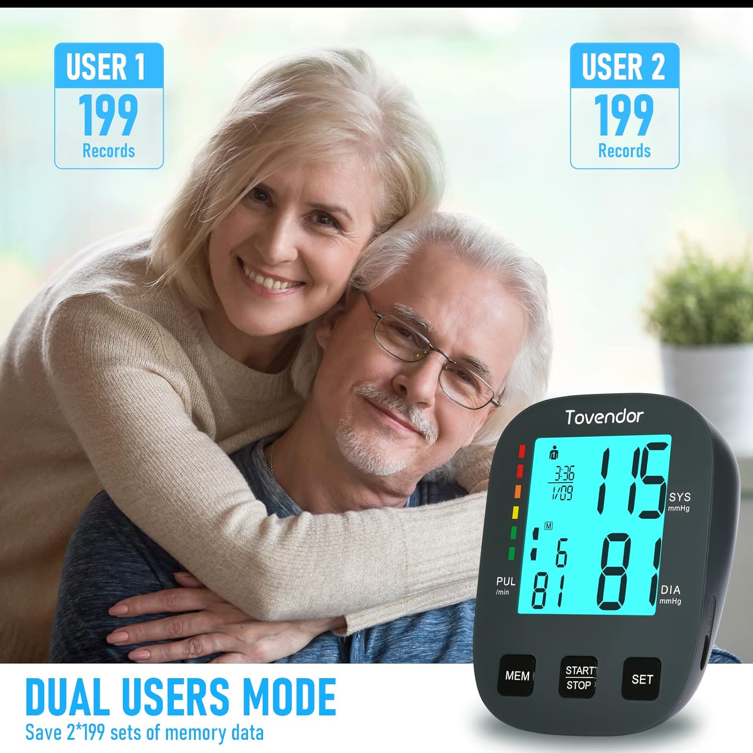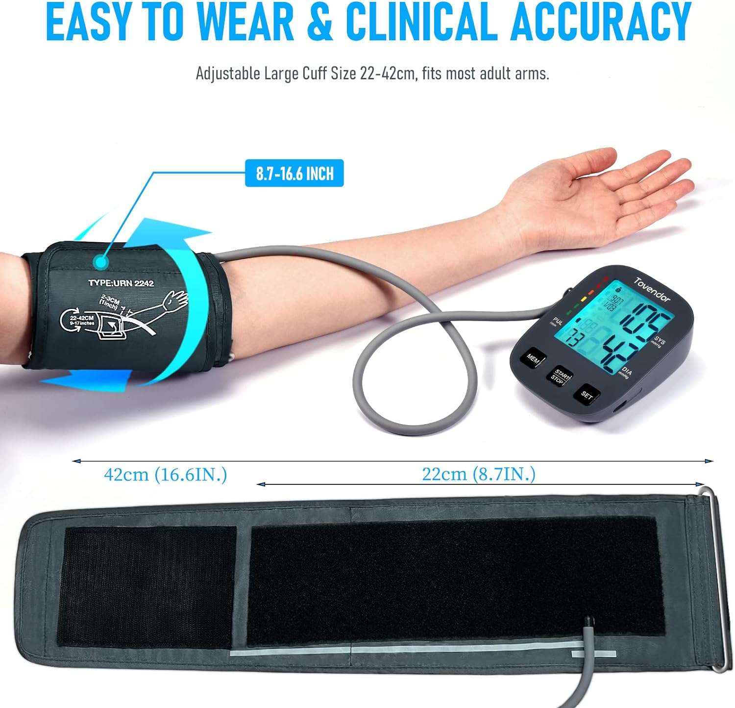 Blood Pressure Cuff Upper Arm, Tovendor Accurate Digital BP Monitor with Adjustable 8.7-16.5in. Cuff for Home Use, Automatic Blood Pressure Machine with Pulse Rate, 2*199 Sets Memory, 4*AAA Batteries