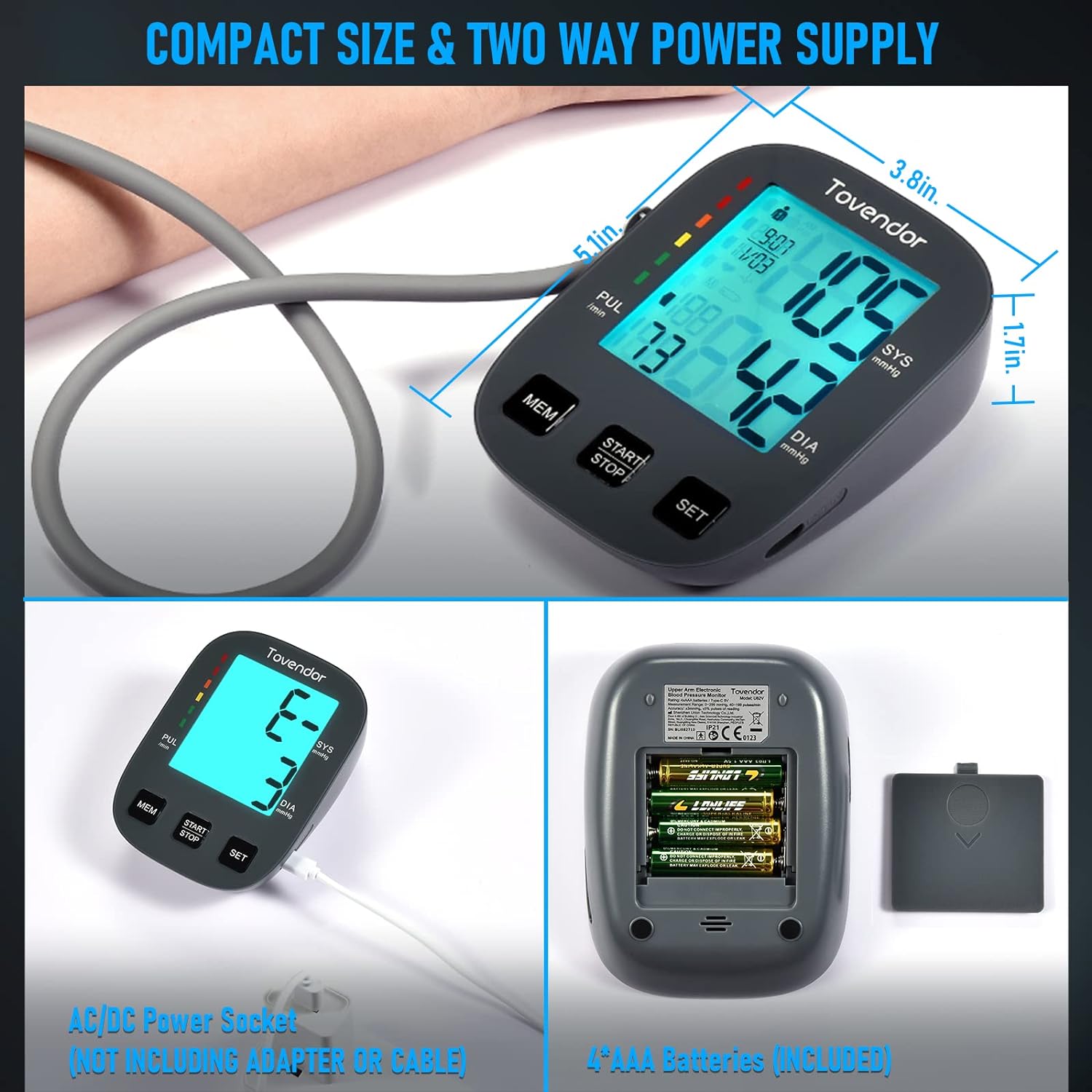 • Two Power Supply: This blood pressure monitor can be operated by 4 AAA batteries (included) or Type-C charging cable (not included).