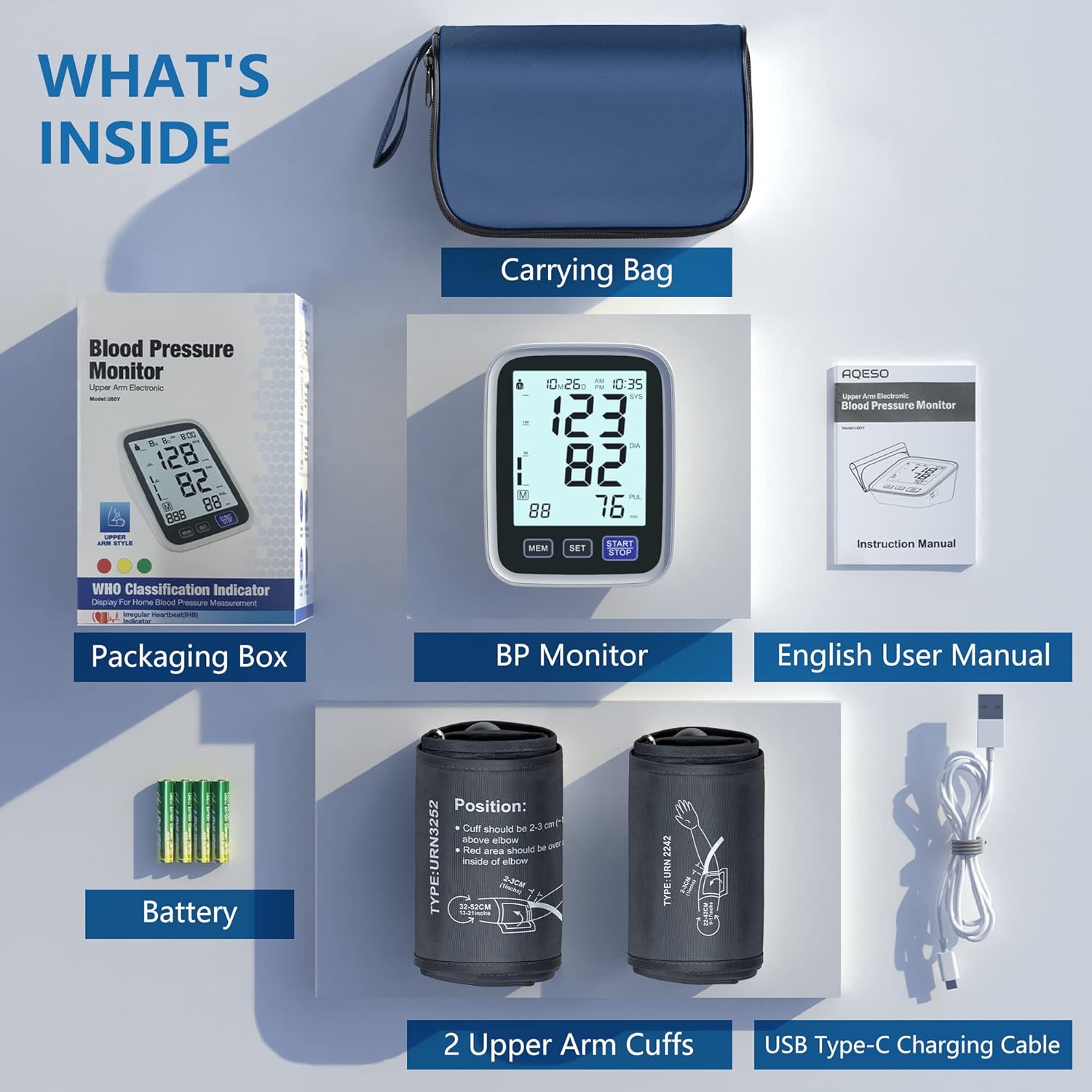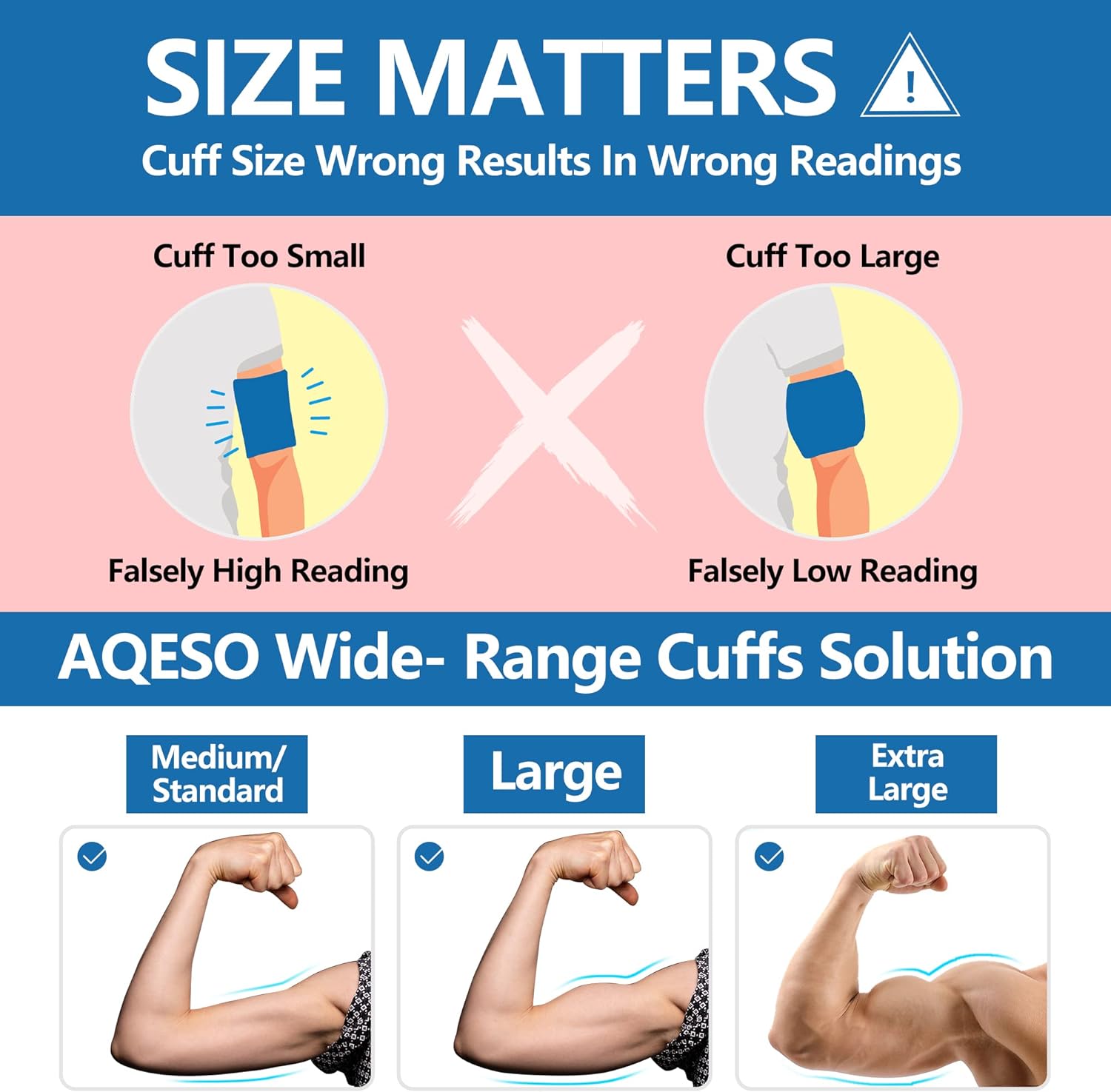 • 2 BP Cuffs Fit Most - As previously mentioned, the AQESO patented proportional valve system supports adjustable wide-range cuffs for you to choose from. The package includes two cuffs that can fit arm sizes ranging from standard (medium) to extra large (9"-21" in circumference). The cuff's ergonomic design ensures a comfortable user experience. If you're unsure about how to measure and select the appropriate cuff size, please send us an inquiry message.
