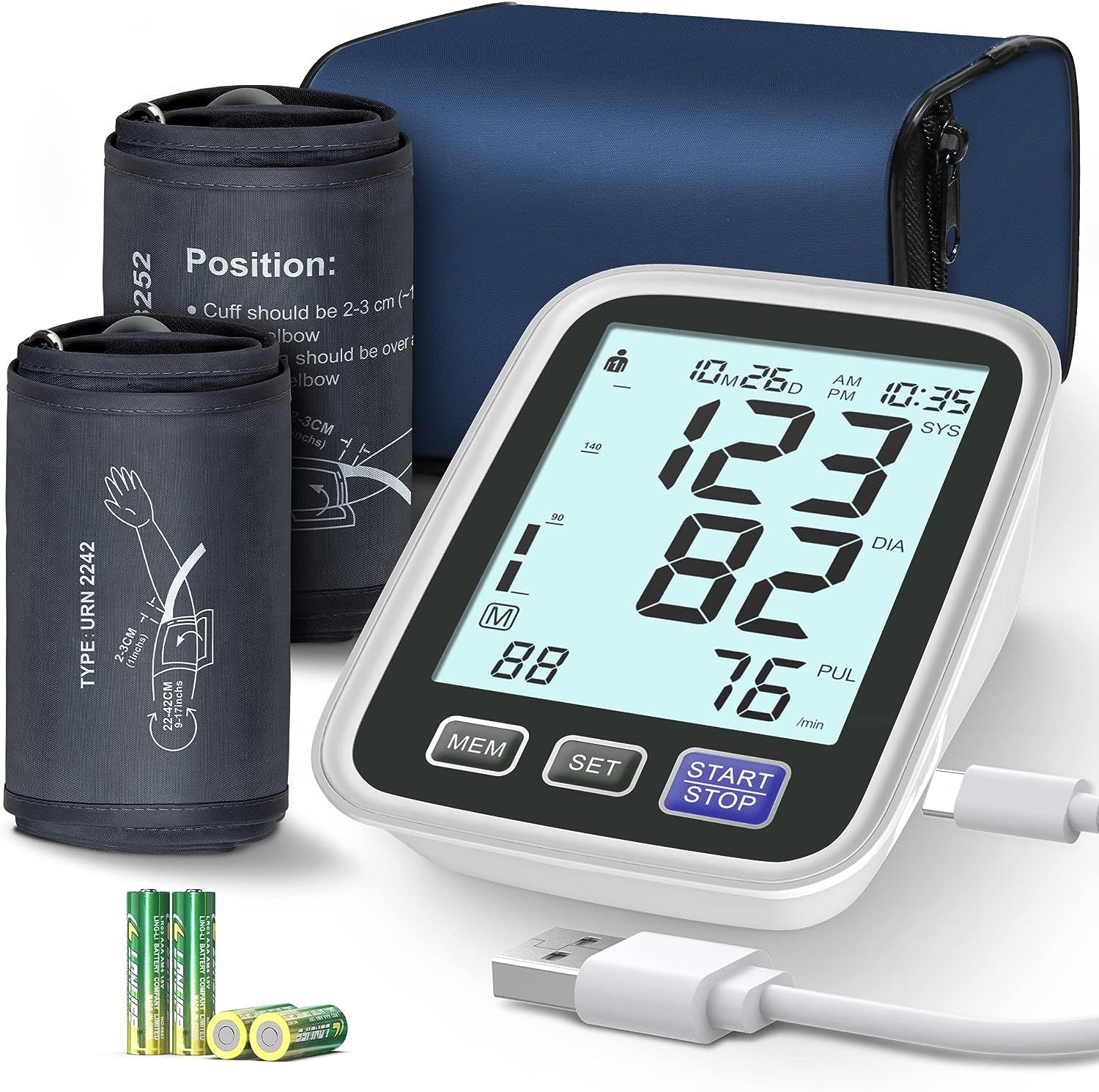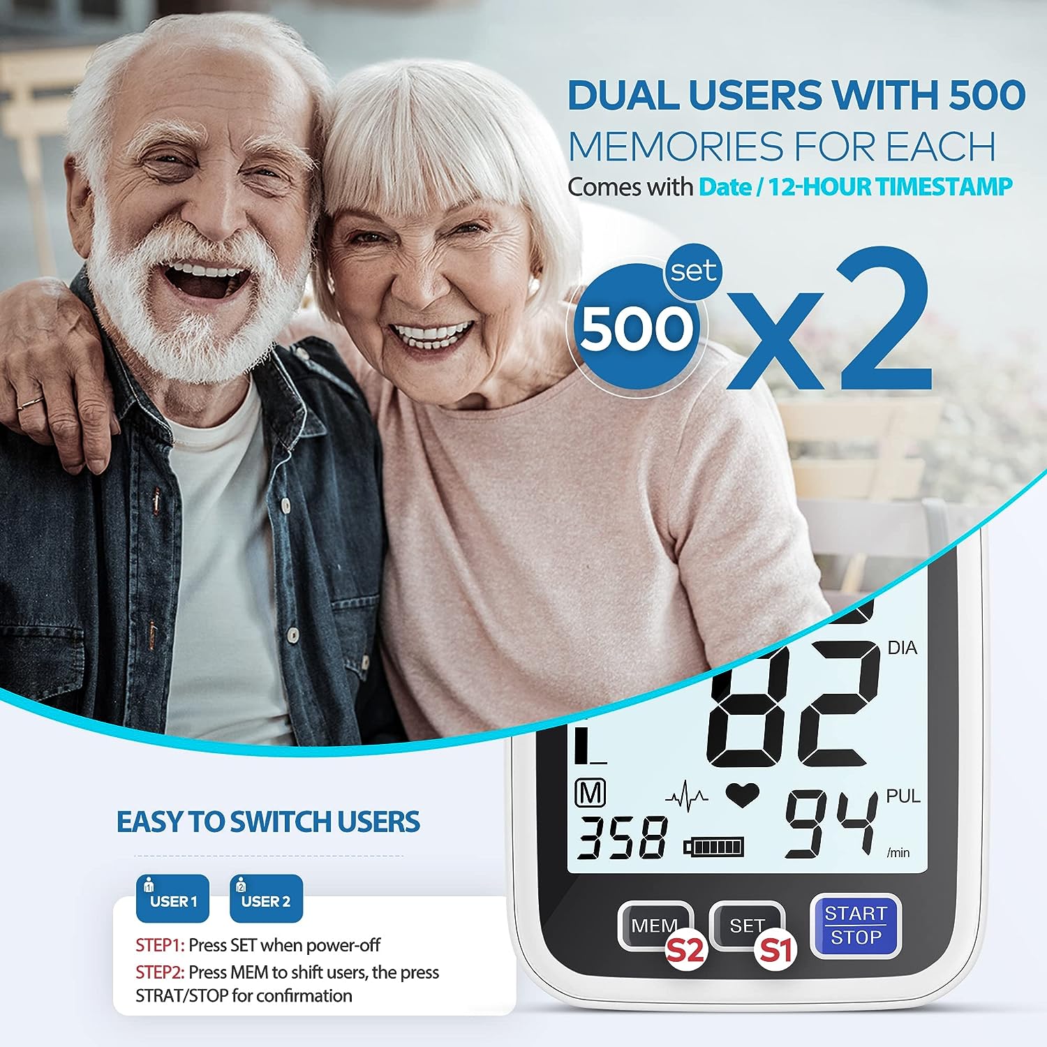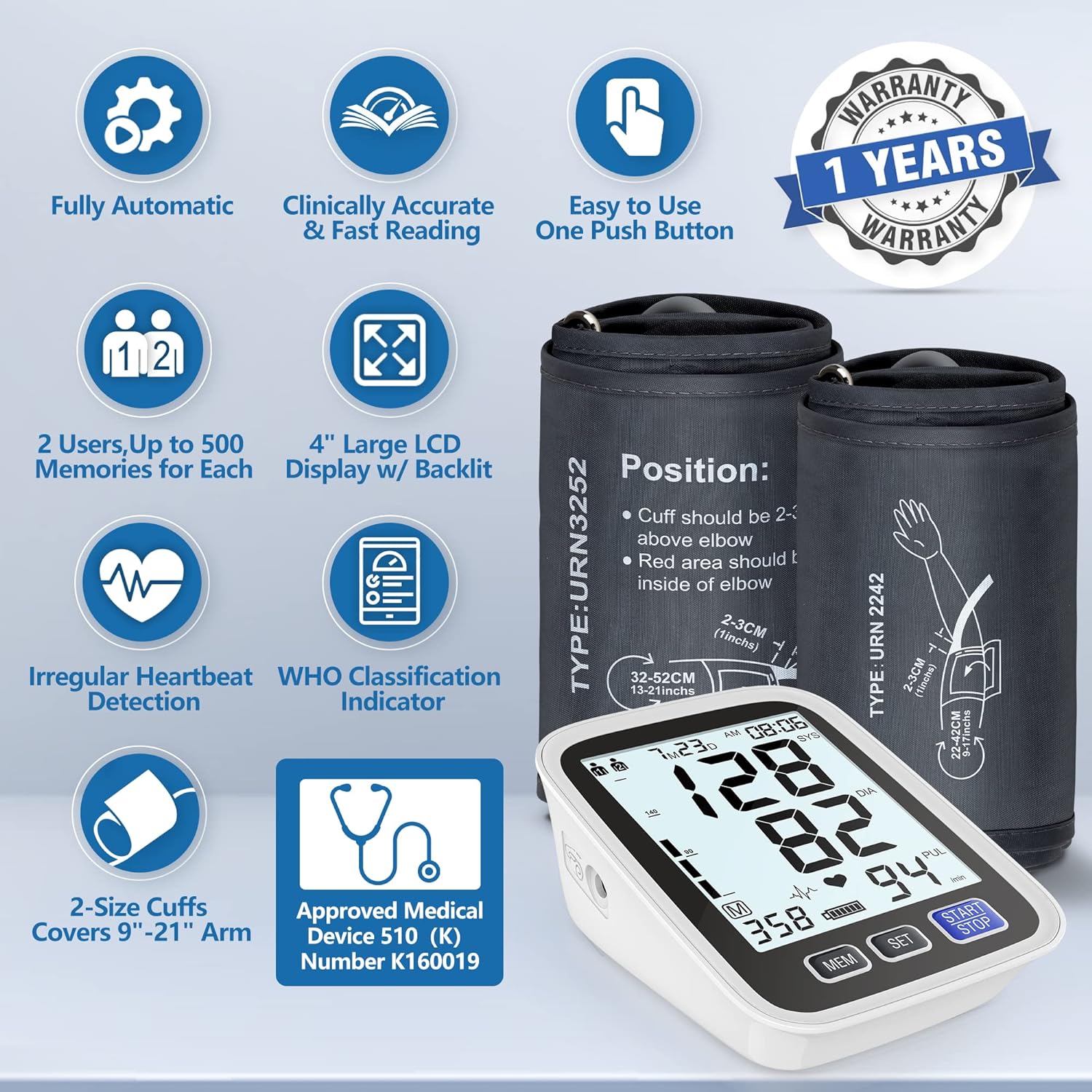 Blood Pressure Machine Upper Arm, 2 Size Cuffs, Medium/Large 9"-17" and Extra Large 13"-21", Accurate Automatic Digital BP Cuff Home Use, Large Backlit LCD, BP Monitor 2-User 1000 Mem