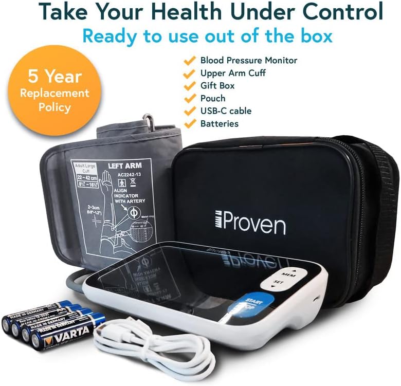 • READY TO USE RIGHT OUT OF THE BOX: Besides the wireless BPM device, you get a convenient case, batteries, Bluetooth app instructions, a detailed manual, a USB-C cable, and a 5-year replacement policy. Get your iProven device today, and take control of your health!