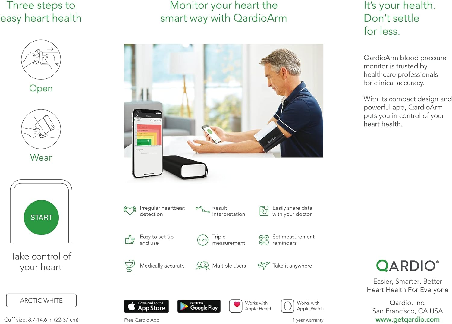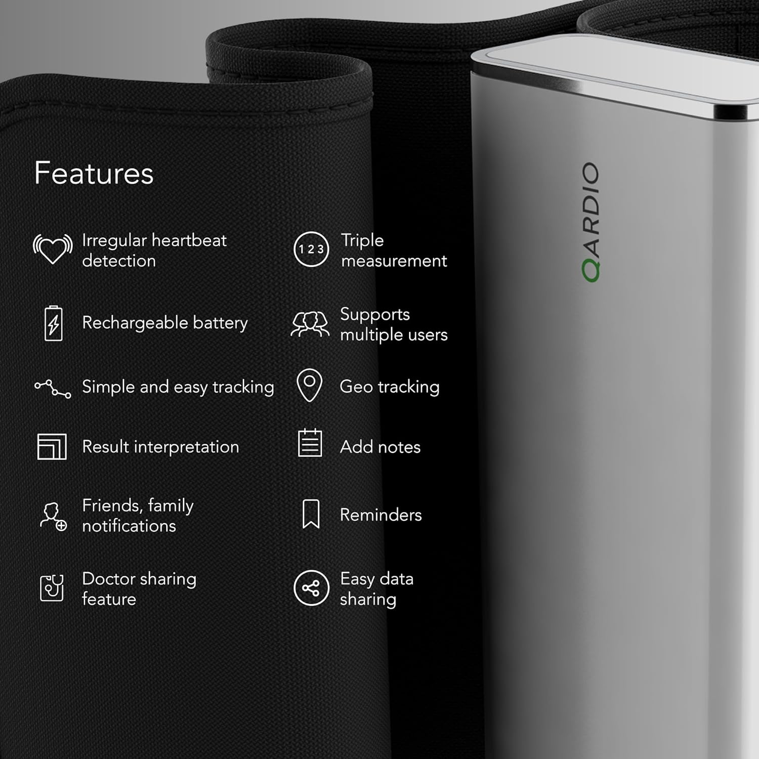 QardioArm wireless blood pressure monitor is clinically validated and recommended by doctors. It measures systolic/diastolic blood pressure, heart rate, mean arterial pressure, and pulse pressure with irregular heart beat detection. App-Enabled for iOS, Android, Apple Watch.