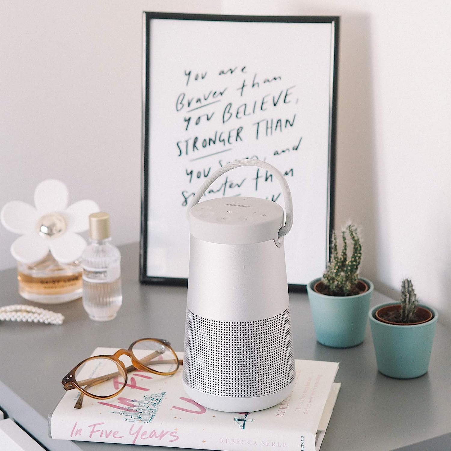 The SoundLink Revolve+ II is engineered to deliver true 360° sound for consistent, uniform coverage. Place it in the center of the room to give everyone the same experience. Or set it near a wall and sound will radiate and reflect around the room, immersing you in that same feeling you felt at your favorite show. The tapered cylindrical shape and flexible fabric handle make this Bluetooth speaker easy to grab and go. Its durable aluminum body provides worry-free protection, and its water- and dust-resistant design (IP55 rating) lets you keep the party going, even if it gets splashed by the pool. The rechargeable, lithium-ion battery plays up to 17 hours — for full-day listening. Voice prompts talk you through wireless Bluetooth pairing, and you can easily take calls with the built-in speakerphone. You can even access your device’s default voice assistant right from your speaker. Connect the speaker to an Amazon Alexa-enabled device, like the Echo Dot, for even more control. Pair two SoundLink Revolve speakers in Party Mode for more performance. Try Stereo Mode where instruments and vocals will naturally separate and spread across an immersive soundstage — making your music sound and feel as you know it should. Bose SimpleSync technology lets you pair the Bluetooth speaker with a member of the Bose Smart Family to play in sync. The Bose Connect app helps you manage your devices, unlock features, and access future updates. You can easily charge the speaker via Micro-B USB port. And the auxiliary input allows you to connect to other audio sources. This mobile speaker is available in Triple Black or Luxe Silver. Included: SoundLink Revolve+ II Bluetooth speaker; USB cable; wall charger.