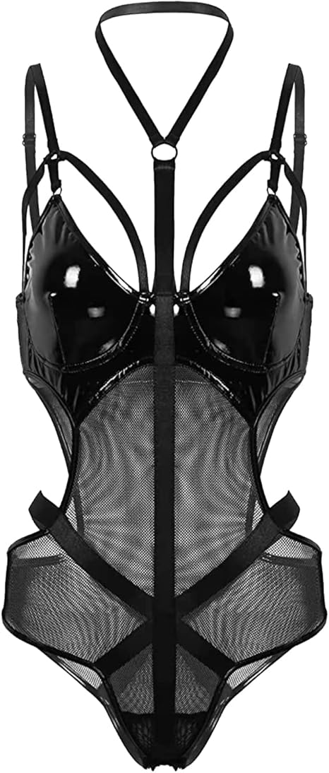 Women Wetlook Leather One Piece Lingerie Lace Teddy Corset Bodysuit Clubwear
