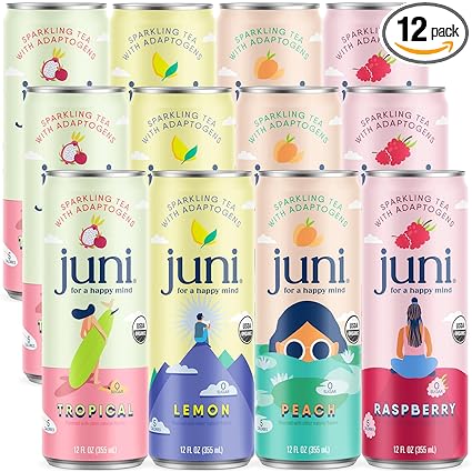 Juni Sparkling Tea Adaptogen Drink - Zero Sugar Nootropic Drinks, Natural Caffeine from Green Tea, 5 Calories, Organic Iced Tea, Vegan, 12 Fl Oz Cans, Variety 12-Pack