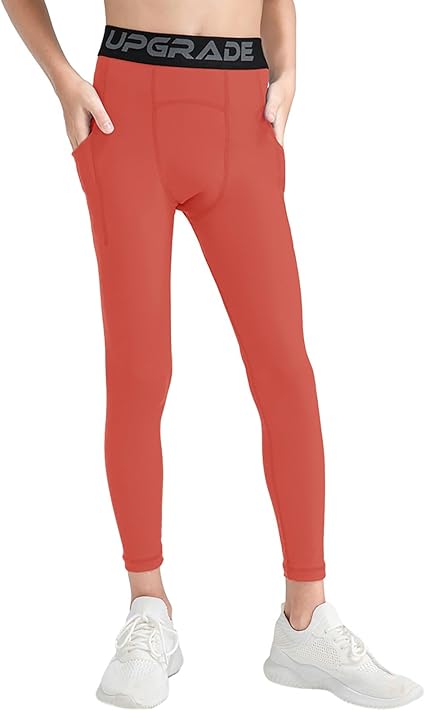 Boys Compression Pants Quick Dry Athletic Sports Leggings Youth Pocket Tights Football Basketball Baselayer, 5-12T Red