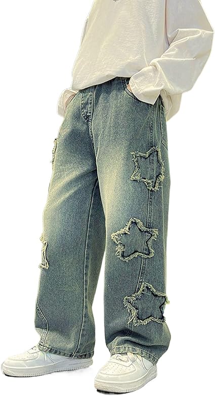 Boy's Pull On Jeans Cute Star Baggy Denim Pants Elastic Waist Straight Wide Leg Jeans for Teen Boys 8-14 Years