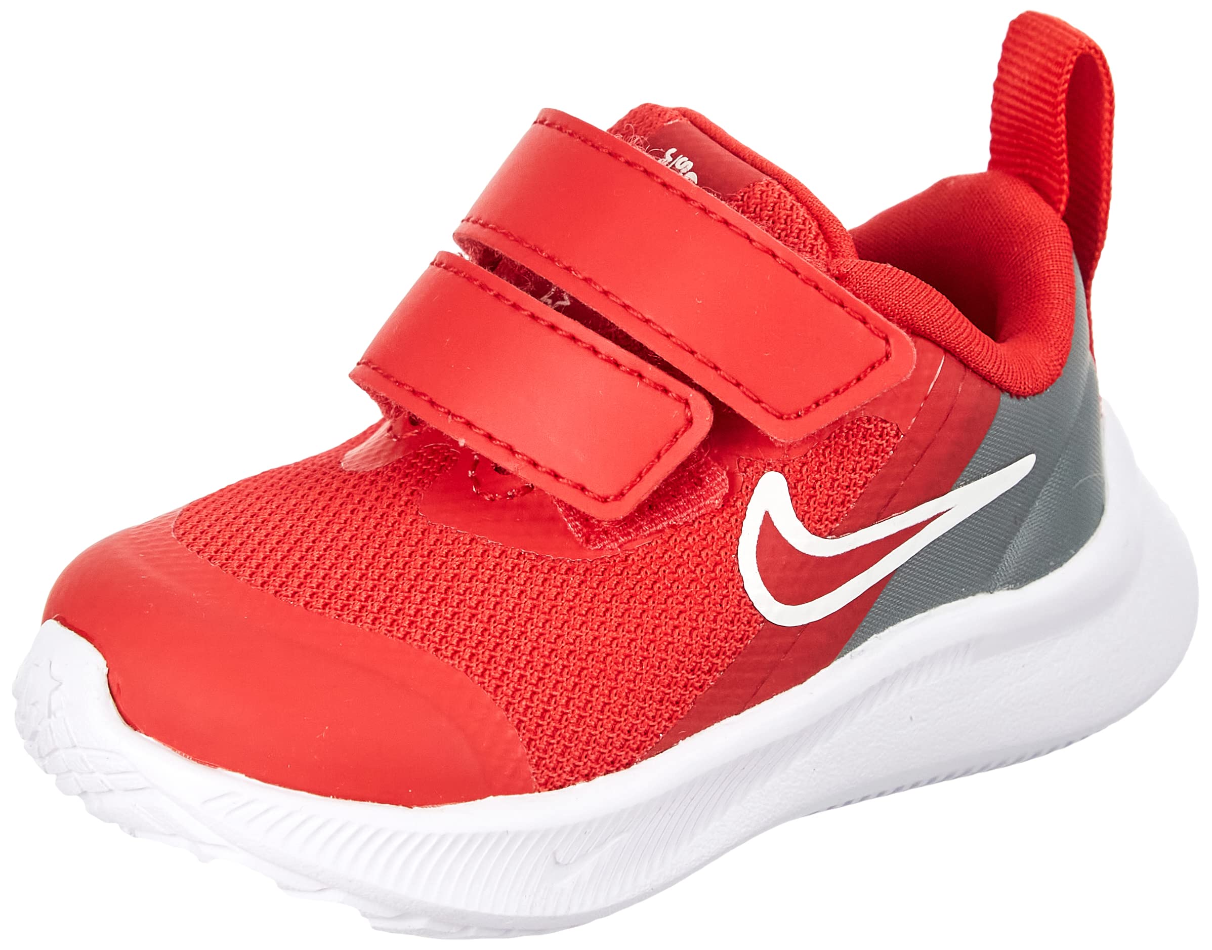 Details: MADE FOR FUTURE STARS.We've got some serious star power here. The Nike Star Runner 3 shoots for the sky with play-ready shoes made for each crawl to every growing step. We've added 2 straps for easy takeoff, plus supersoft foam and lots of flexibility to rocket up the comfort. Designed with the Earth in mind, they're made with at least 20% recycled content by weight. Play ReadyRecycled mesh on the front of the shoe helps little feet stay cool and gives toes wiggle room to move. Synthetic leather around the heel gives stability and durability. Strappy Support2 hook-and-loop straps make these kicks so easy to take on and off-any kid can learn to do it! Star Studded CushioningThe plush foam sole provides soft cushioning, and flex grooves help make every step feel natural. A star is molded near the toe to depict a shooting star across the foot. A skin layer across the toe tip provides extra durability for little ones who drag their toes. The waterfall-shaped collar (with extra padding) provides slip-in comfort. Measurements: Weight: 6.5 ozProduct measurements were taken using size 10 Toddler, width M. Please note that measurements may vary by size.Weight of footwear is based on a single item, not a pair.