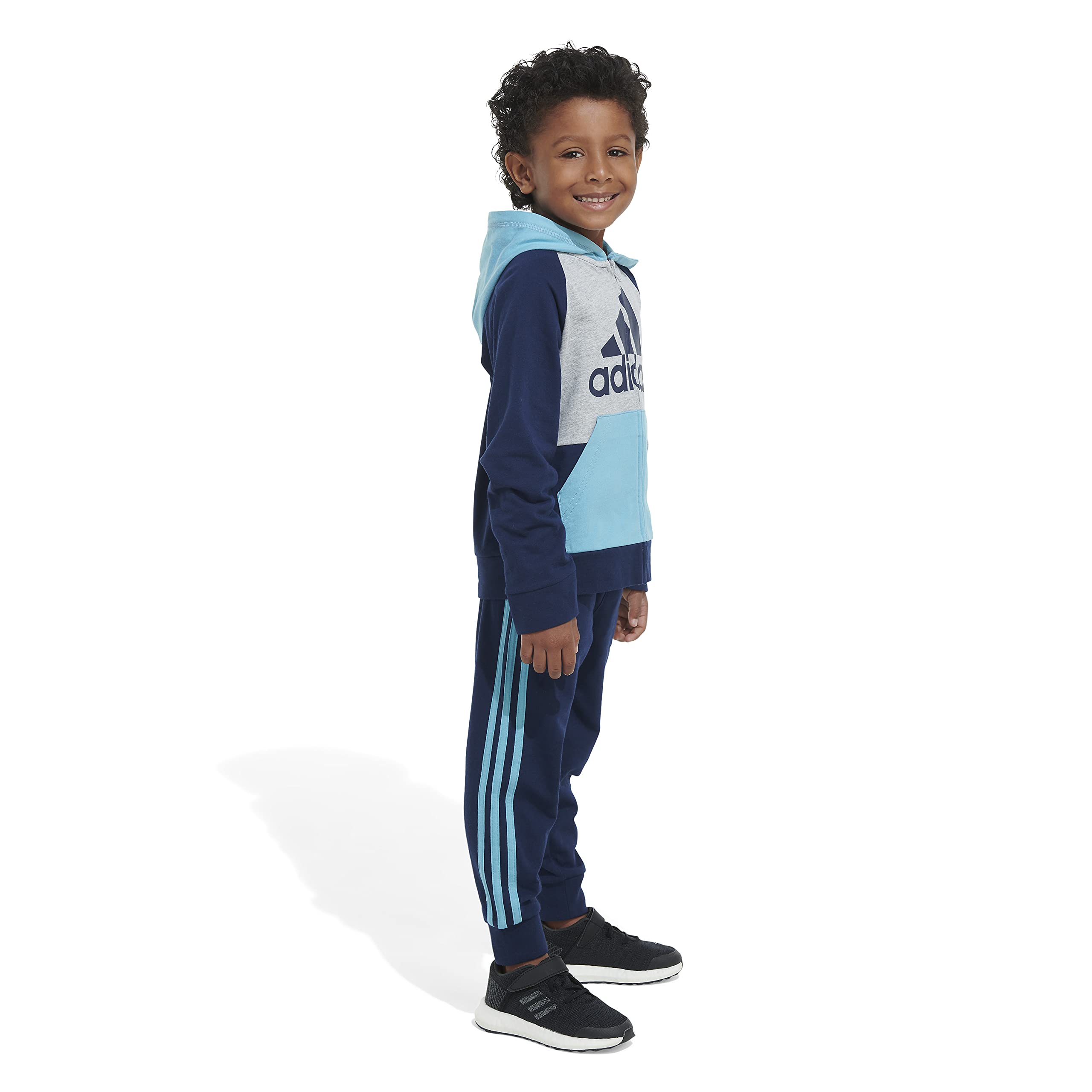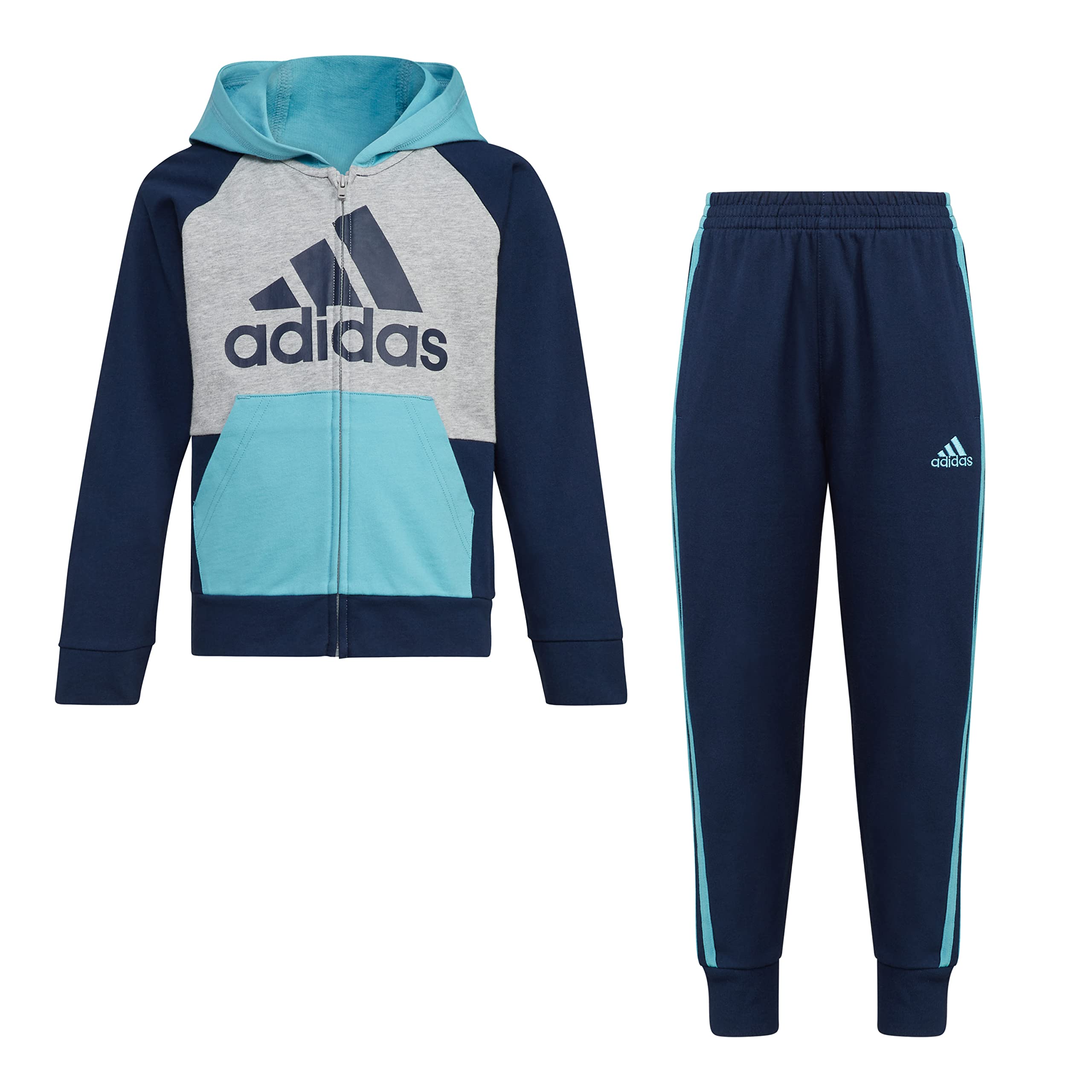 Details: When the cold months roll in, keep your guy cozy in this boys' adidas set. The soft French terry hoodie has a full-zip front, so it's easy to layer. The matching pants have a stretchy elastic waistband for easy on and off.