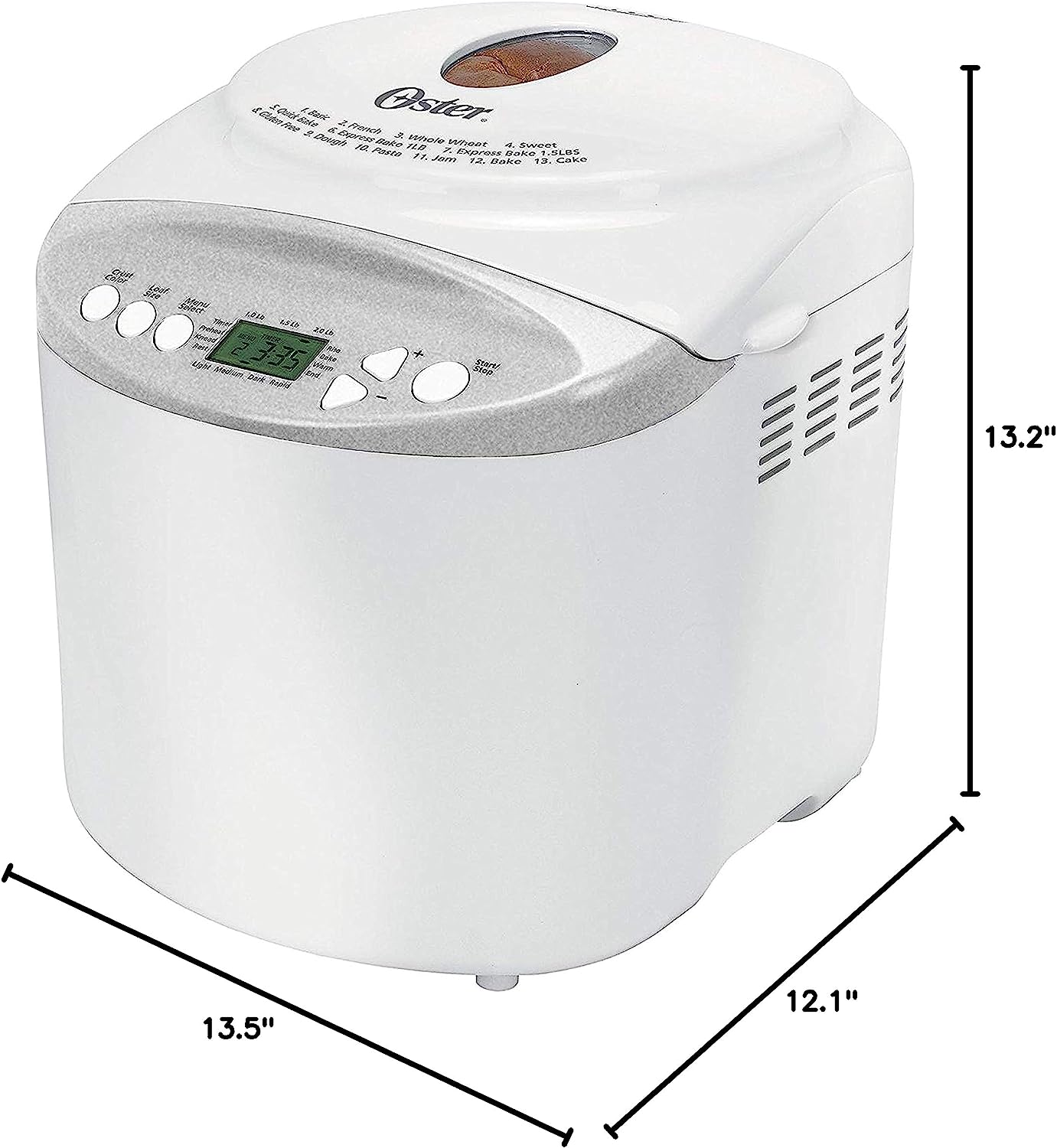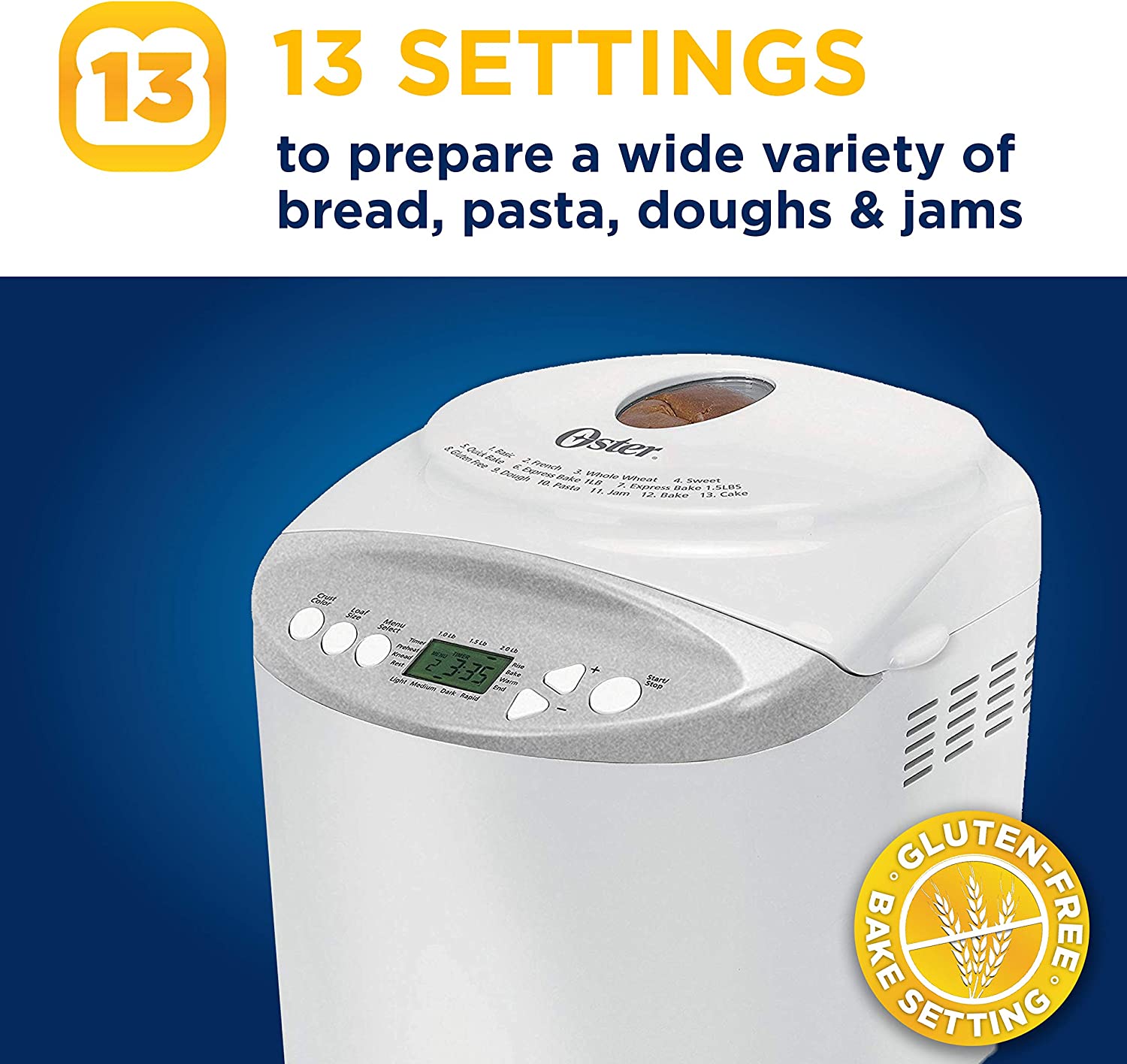 Make bakery-style artisan bread at home with the Oster Expressbake Bread Maker with Gluten-Free Setting. With its compact, user-friendly design, 13 settings including express and gluten-free options, and 3 crust selections, this countertop bread maker makes it easy to bake a variety of breads whether you want cinnamon raisin bread in the morning, whole wheat sandwich bread in the afternoon, or buttery dinner rolls. This bread machine features an ExpressBake cycle that bakes delicious loaves in as little as one hour. The large LCD display allows you to easily navigate the settings, while the programmable timer lets you delay the bake time by up to 13 hours--so you can prepare ahead and enjoy a freshly baked loaf exactly when you want it. The bread maker comes complete with measuring tools, kneading blades, and delicious recipes. Ideal for larger families, the Expressbake bread maker has up to a 2-pound loaf capacity.