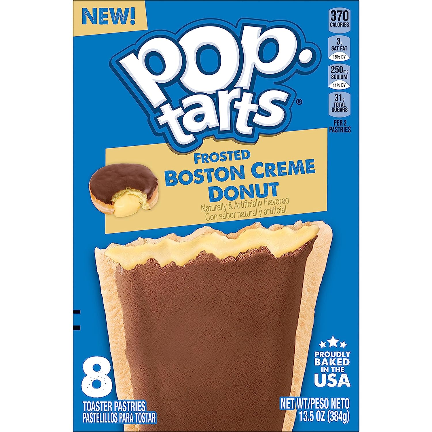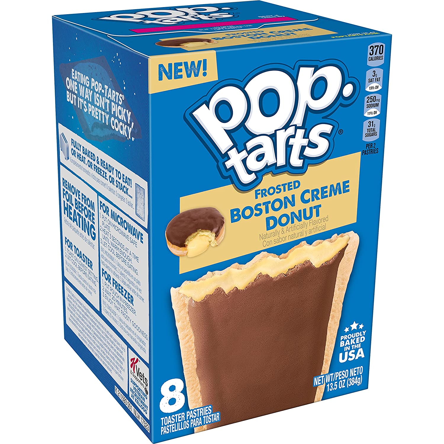 Treat everyone to the bakery-inspired taste of Pop-Tarts breakfast toaster pastries. Includes one, 13.5-ounce box containing 8 Frosted Boston Creme Donut flavored toaster pastries. Each foil pouch delivers delicious pastry crust, sweet chocolatey frosting, and creme flavored filling. Serve these toaster pastries to your family as a part of a warm breakfast by putting them in your toaster or heating them in the microwave. Pop-Tarts make a great on-the-go snack; stash them in a lunchbox. Pack them for sports games, camping, road trips and running errands. Freeze them for a chilled dessert or enjoy them right out of the pouch. There are so many ways to indulge yourself or others throughout the day. Every time you tear open the iconic foil pouch, you know a crazy good experience awaits.
