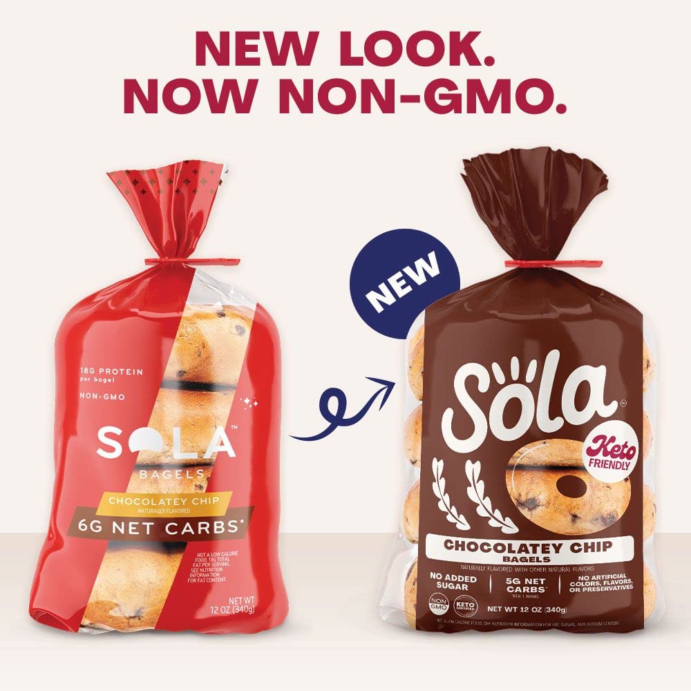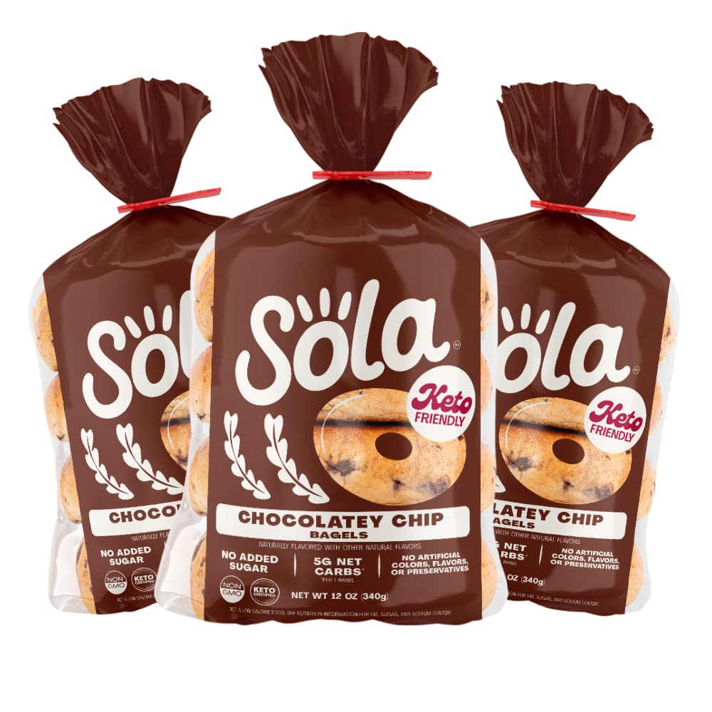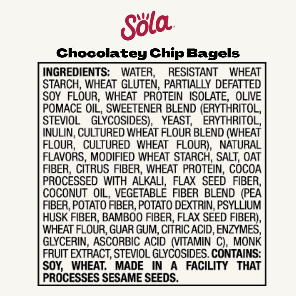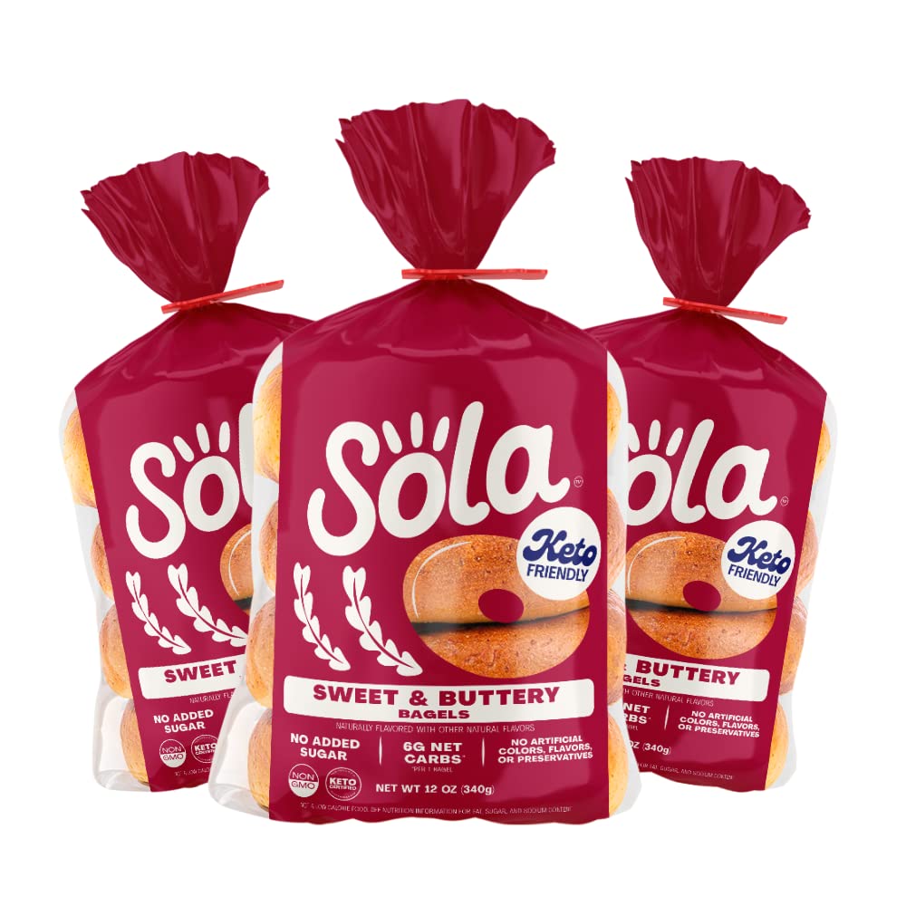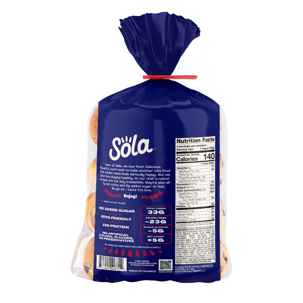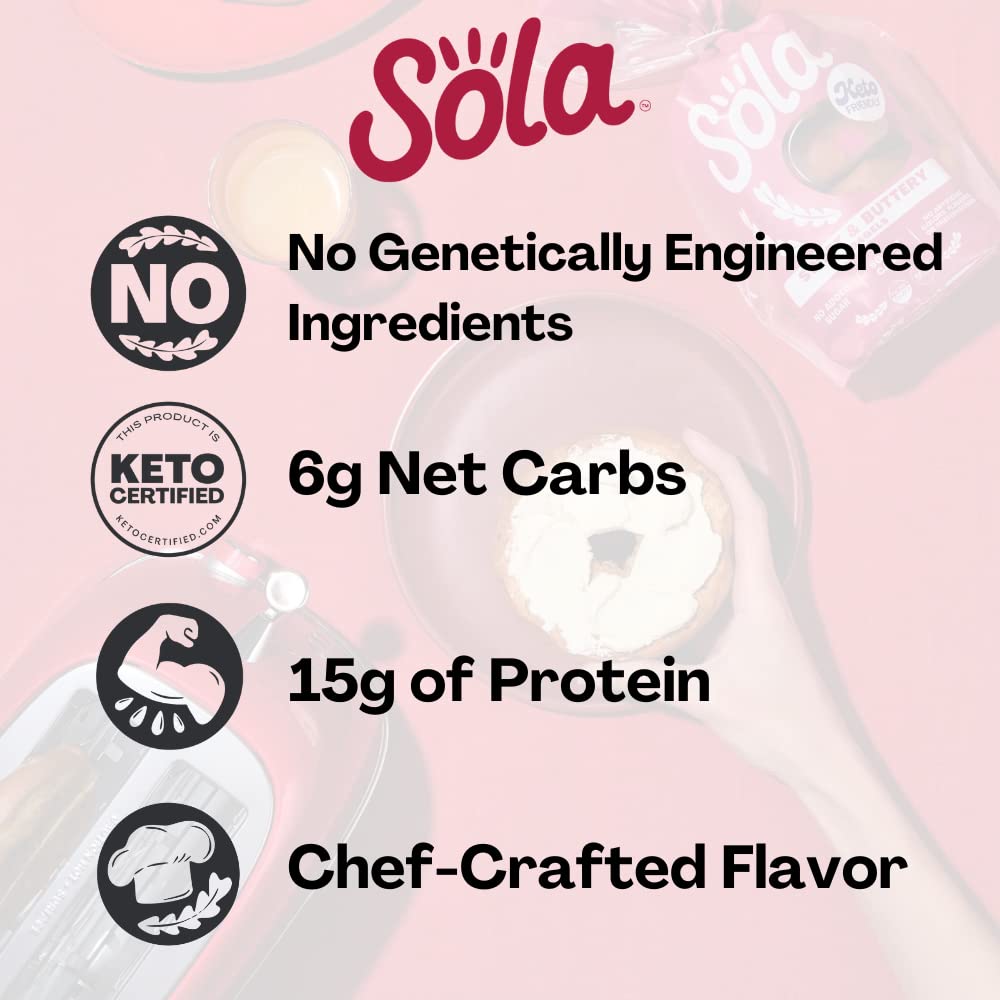 "The low-carb, keto-friendly bagels your breakfast needs LOWER NET CARBS: Using a mixture of arrowroot flour and defatted soy flour we have crafted a mix that allows us to lower the carb count in our bread products, without sacrificing taste. 0G OF SUGAR: We officially have 0g of sugar in every flavor of bagels. We use a mixture of low-carb sweeteners such as erythritol and stevia leaf extract to help create the fluffy, chewy texture you expect from a bagel. Enjoy Sola low-carb & keto-friendly bagels that allow you to eat your favorites without losing any of the taste!"