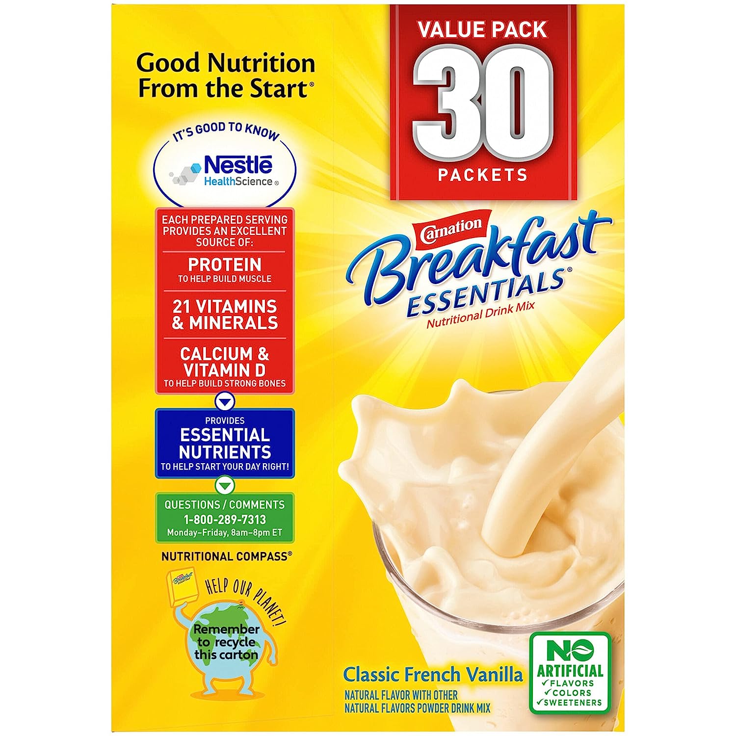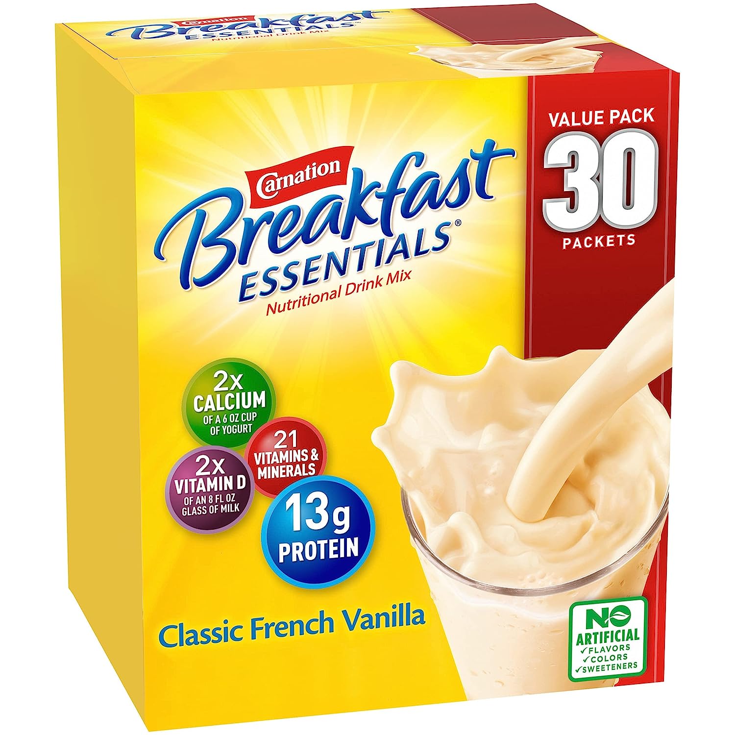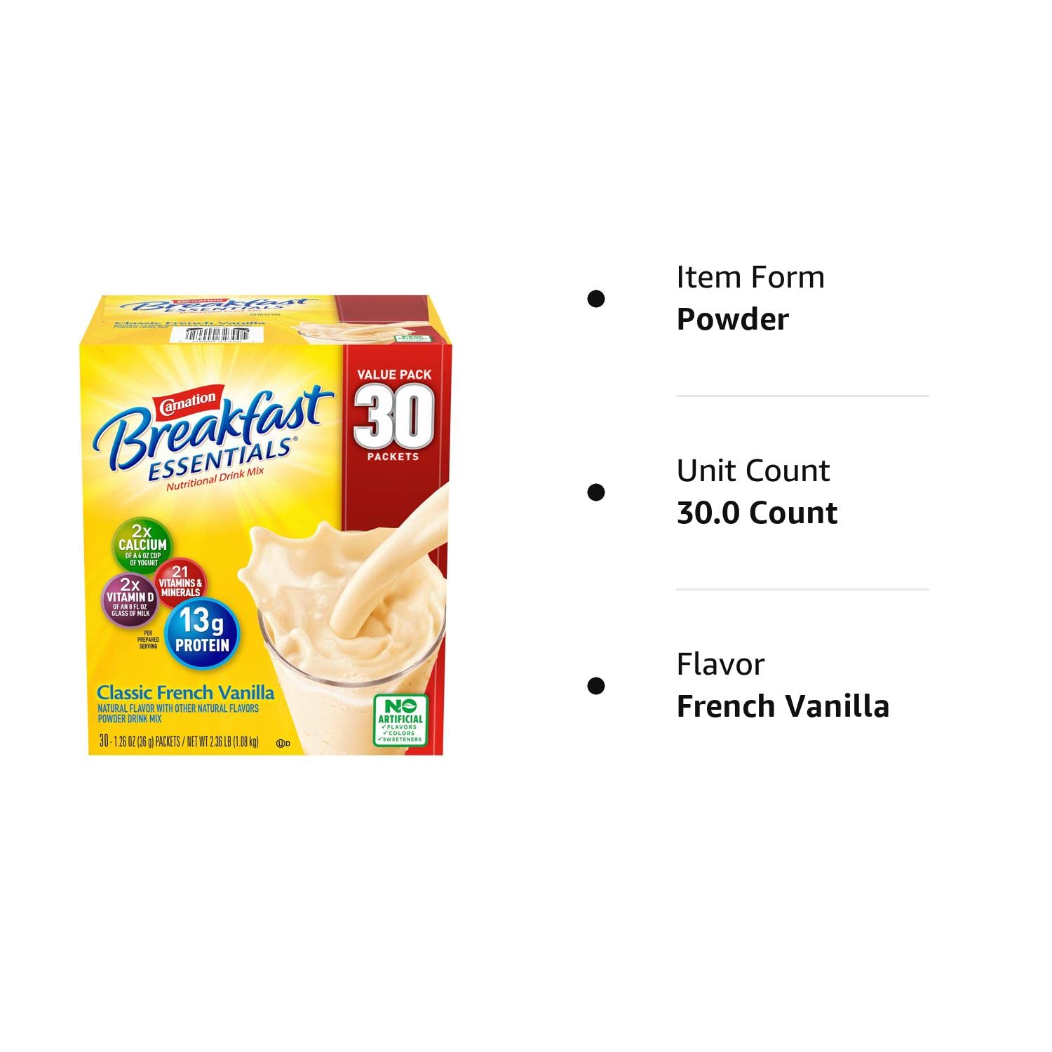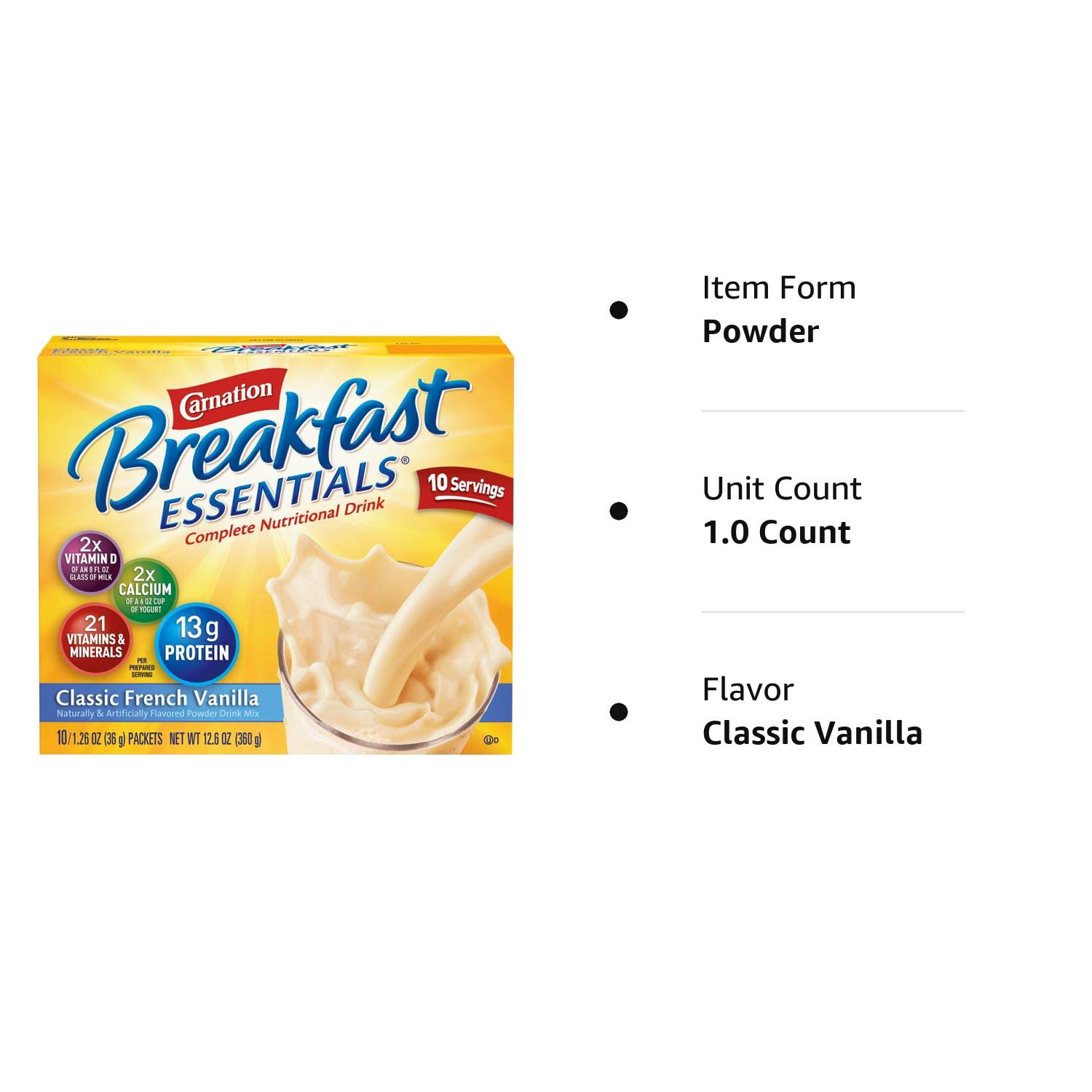 Treat your family to Carnation Breakfast Essentials Powder Drink Mix, which delivers balanced nutrition to start the day right. This nutritional drink is loaded with nutrition and flavor. A single serving mixed with one cup of skim milk provides 220 calories, 13 grams of protein, and 25% or more of the daily value for 21 essential vitamins and minerals, including calcium and vitamin D. Carnation Breakfast Essentials Classic French Vanilla Nutritional Drink mix is a powdered mix that makes a delicious nutritional drinks the whole family will love—just mix with 1 cup of skim milk. Start your day right with this vanilla drink mix that has 13 grams of protein and 220 calories per prepared serving. Carnation Breakfast Essentials Classic French Vanilla powder drink mix is a quick and convenient way for families to get the protein, vitamins and minerals they need to kick off their day. Each prepared serving has 21 vitamins and minerals, including three times the amount of Vitamin D as an eight fluid ounce glass of milk and three times as much calcium as a 5.3 ounce cup of Greek yogurt. The powdered nutrition drinks are great at home or on the go, for breakfast or between meals. The box includes ten 36 gram powder packets for enjoying breakfast shakes on the go. It's hard to balance a healthy lifestyle and a busy day. Carnation Breakfast Essentials nutrition shakes make it easy to start your day with good breakfast nutrition. Nutritionally appropriate for ages 4 years and older, including teens and adults.
