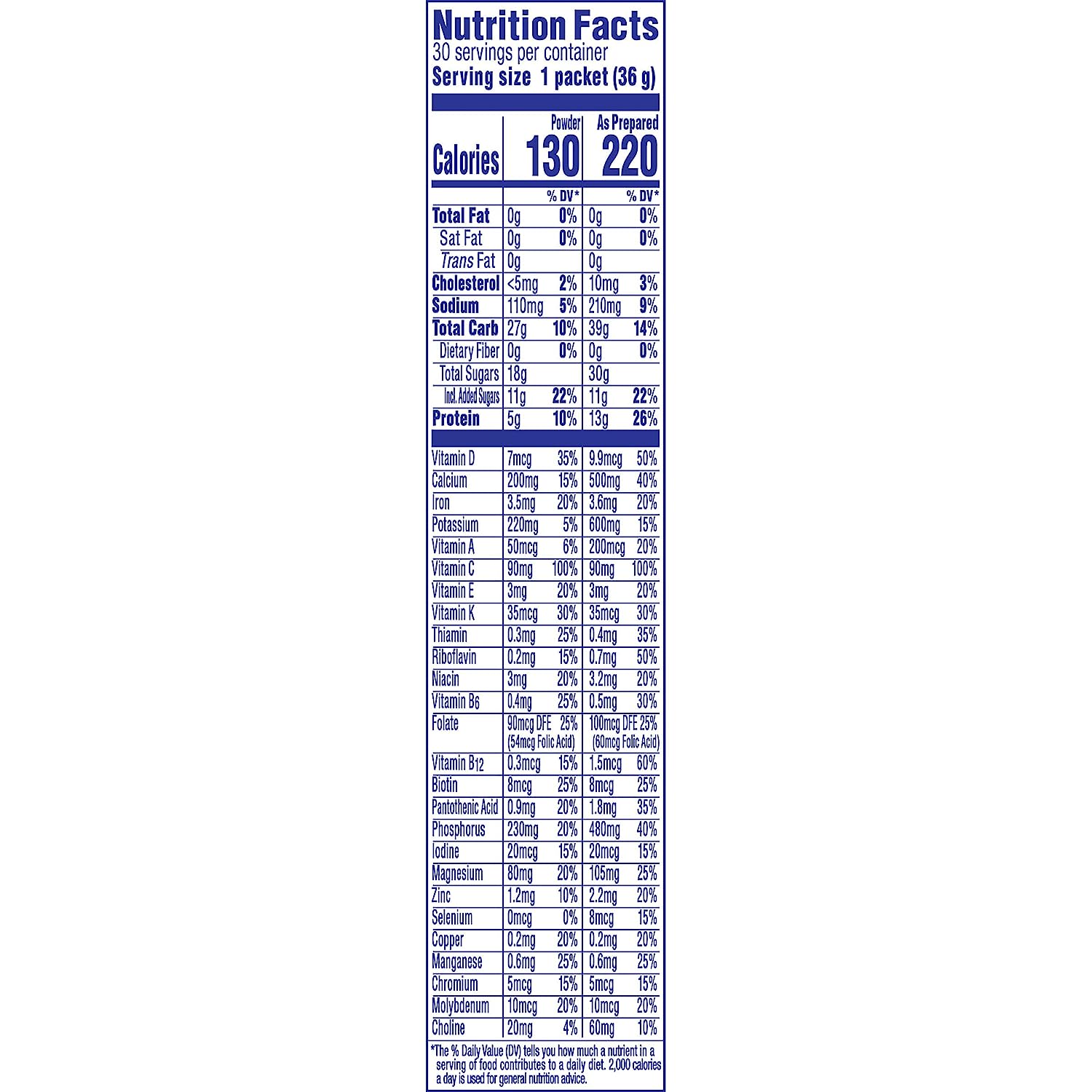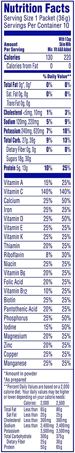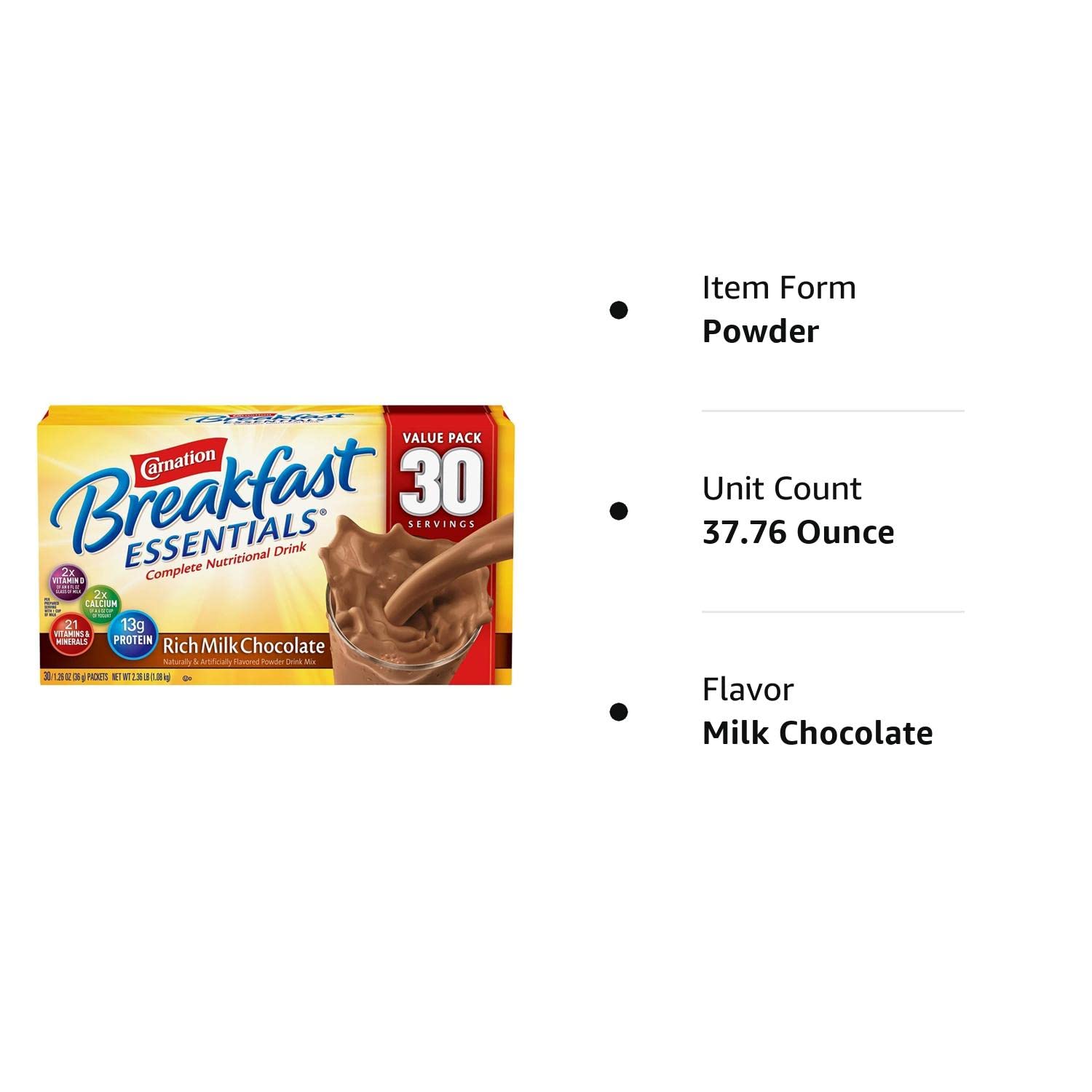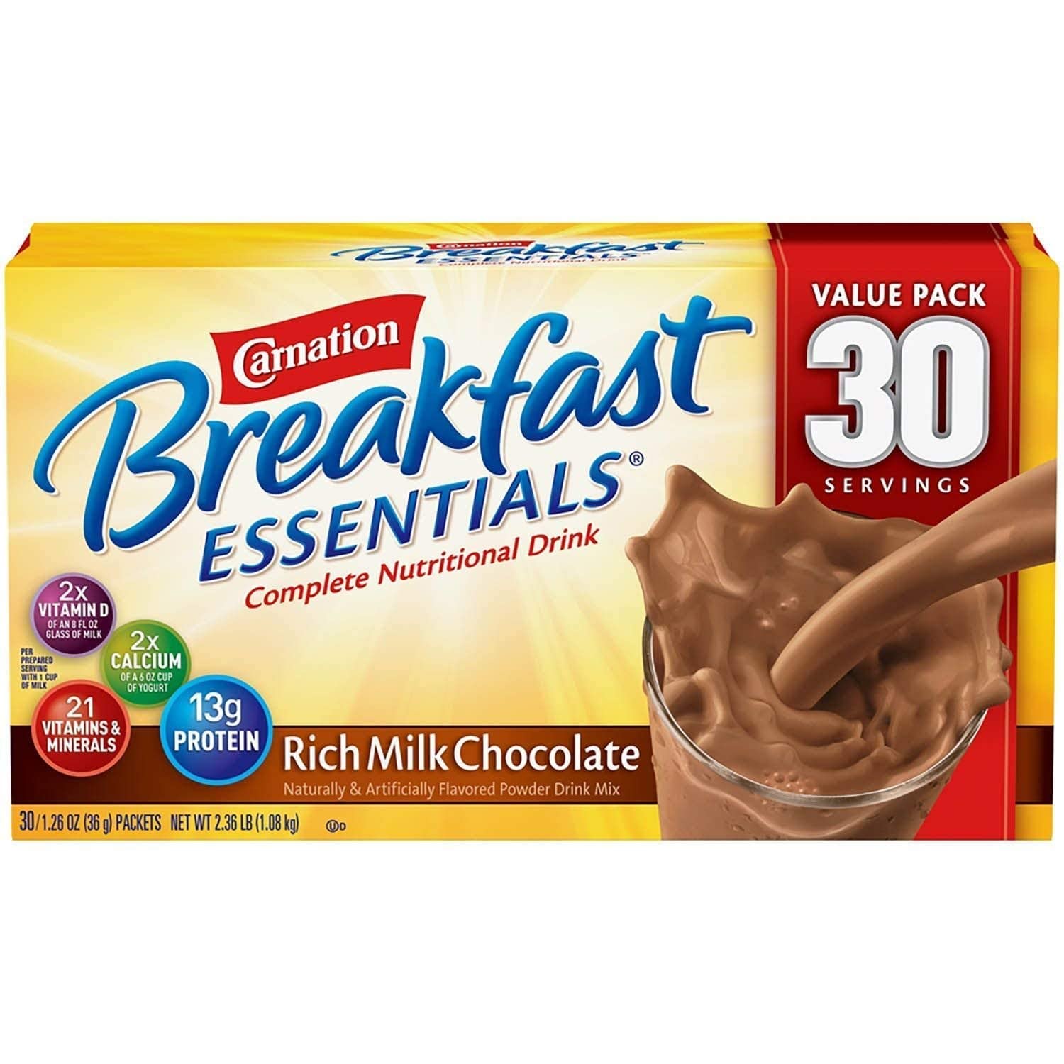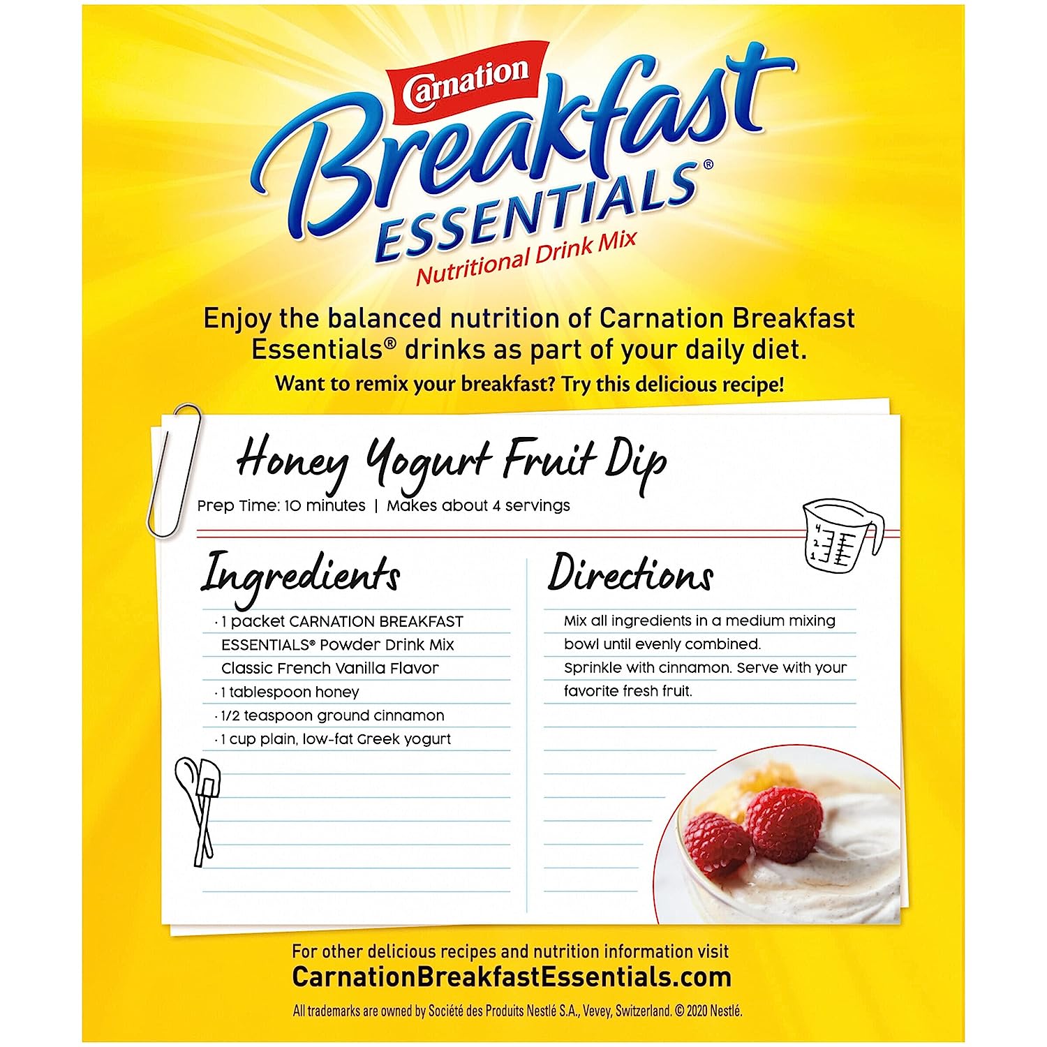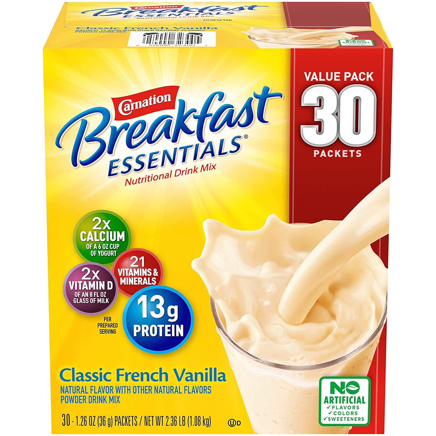 Treat your family to Carnation Breakfast Essentials Powder Drink Mix, which delivers balanced nutrition to start the day right. This nutritional drink is loaded with nutrition and flavor. A single serving mixed with one cup of skim milk provides 220 calories, 13 grams of protein, and 25% or more of the daily value for 21 essential vitamins and minerals, including calcium and vitamin D. Carnation Breakfast Essentials Classic French Vanilla Nutritional Drink mix is a powdered mix that makes a delicious nutritional drinks the whole family will love—just mix with 1 cup of skim milk. Start your day right with this vanilla drink mix that has 13 grams of protein and 220 calories per prepared serving. Carnation Breakfast Essentials Classic French Vanilla powder drink mix is a quick and convenient way for families to get the protein, vitamins and minerals they need to kick off their day. Each prepared serving has 21 vitamins and minerals, including three times the amount of Vitamin D as an eight fluid ounce glass of milk and three times as much calcium as a 5.3 ounce cup of Greek yogurt. The powdered nutrition drinks are great at home or on the go, for breakfast or between meals. The box includes ten 36 gram powder packets for enjoying breakfast shakes on the go. It's hard to balance a healthy lifestyle and a busy day. Carnation Breakfast Essentials nutrition shakes make it easy to start your day with good breakfast nutrition. Nutritionally appropriate for ages 4 years and older, including teens and adults.